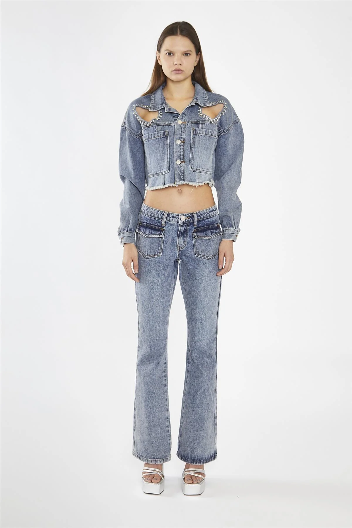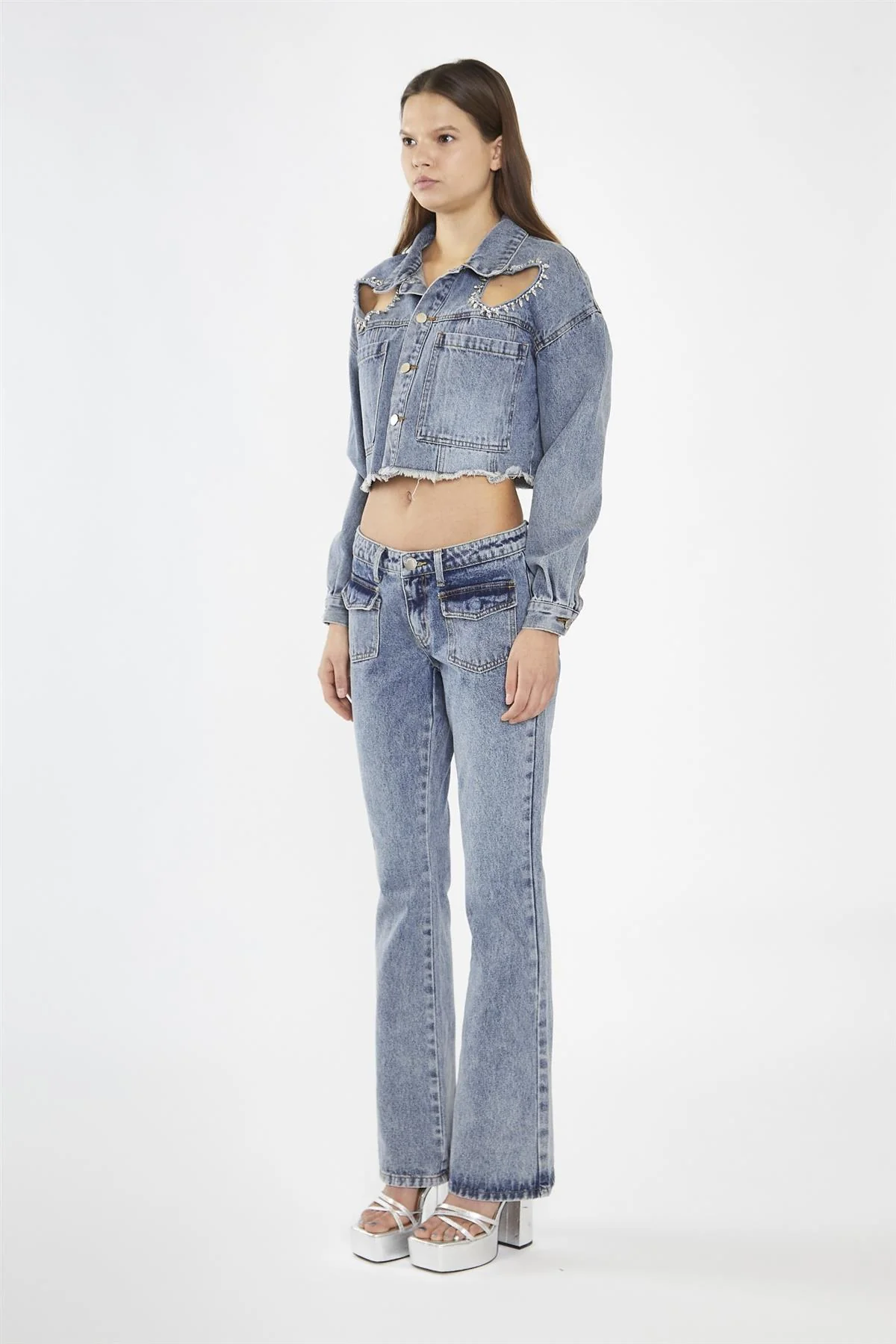 Grey Acid-Wash Denim Low-Rise Jeans