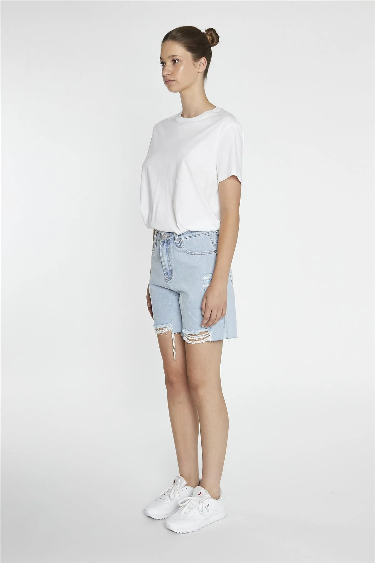 Mid-Stonewash Ripped Denim-Shorts