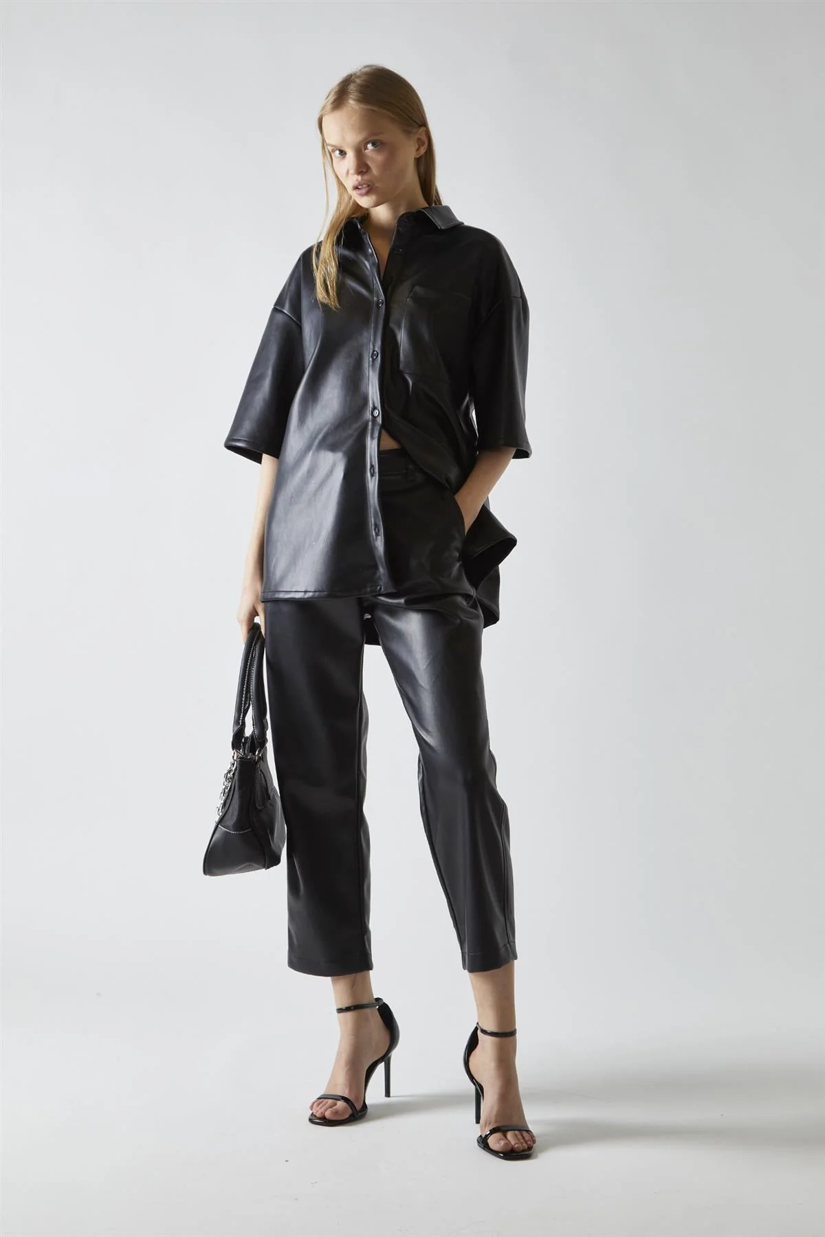 Black-PU Straight-Fit Crop-Trousers