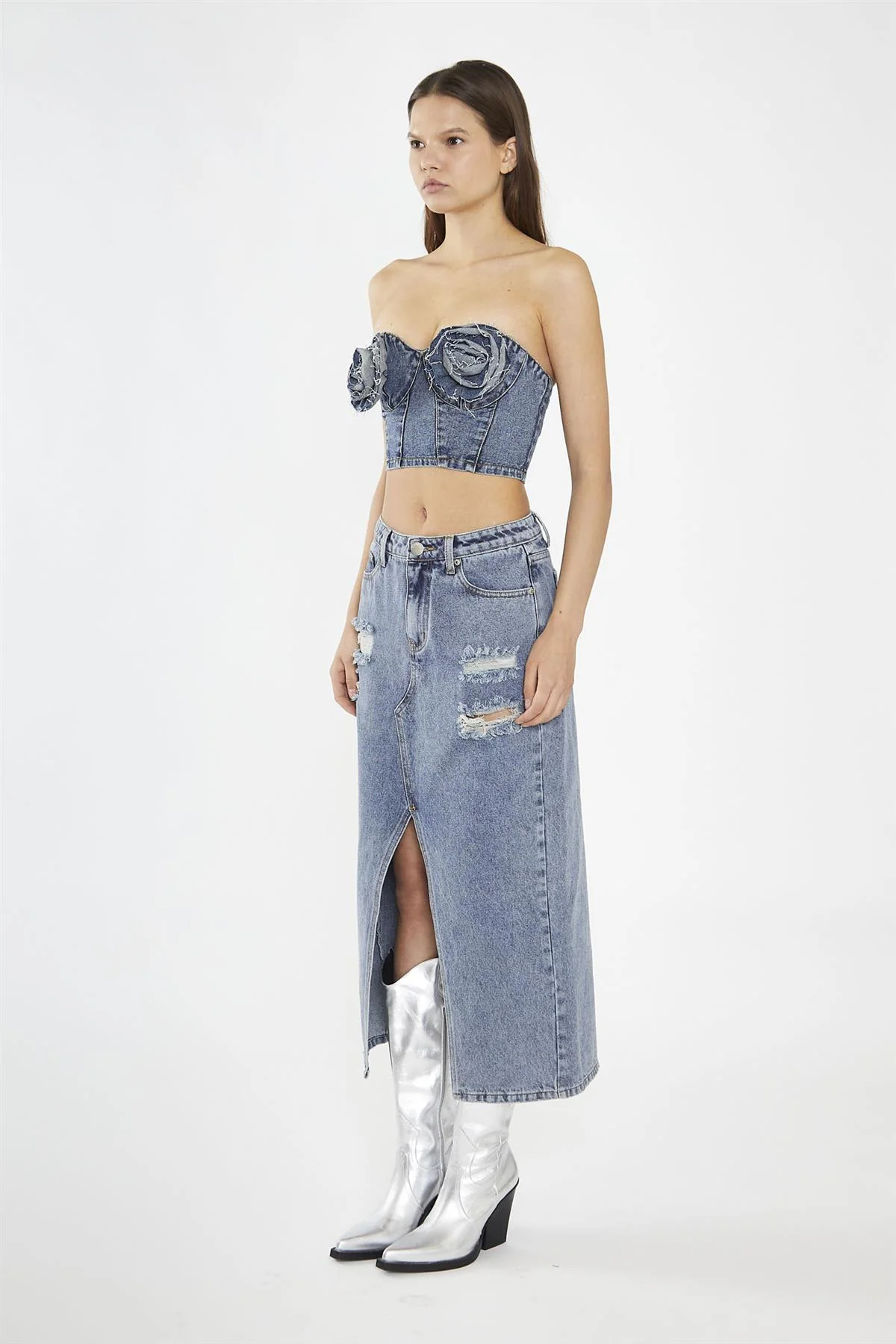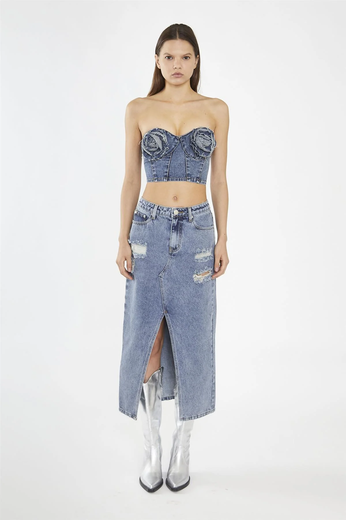 Heavy-Vintage Wash Front-Split Distressed Denim Midi-Skirt