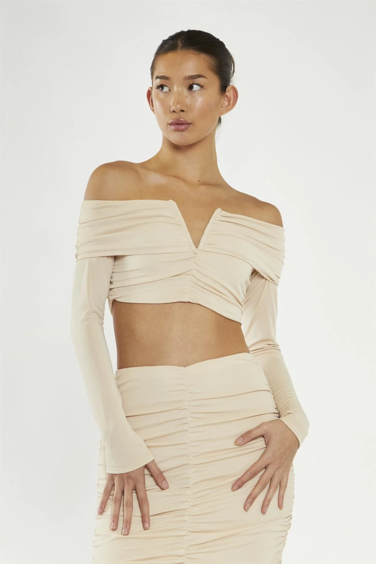 Nude Ruched Bardot Crop-Top