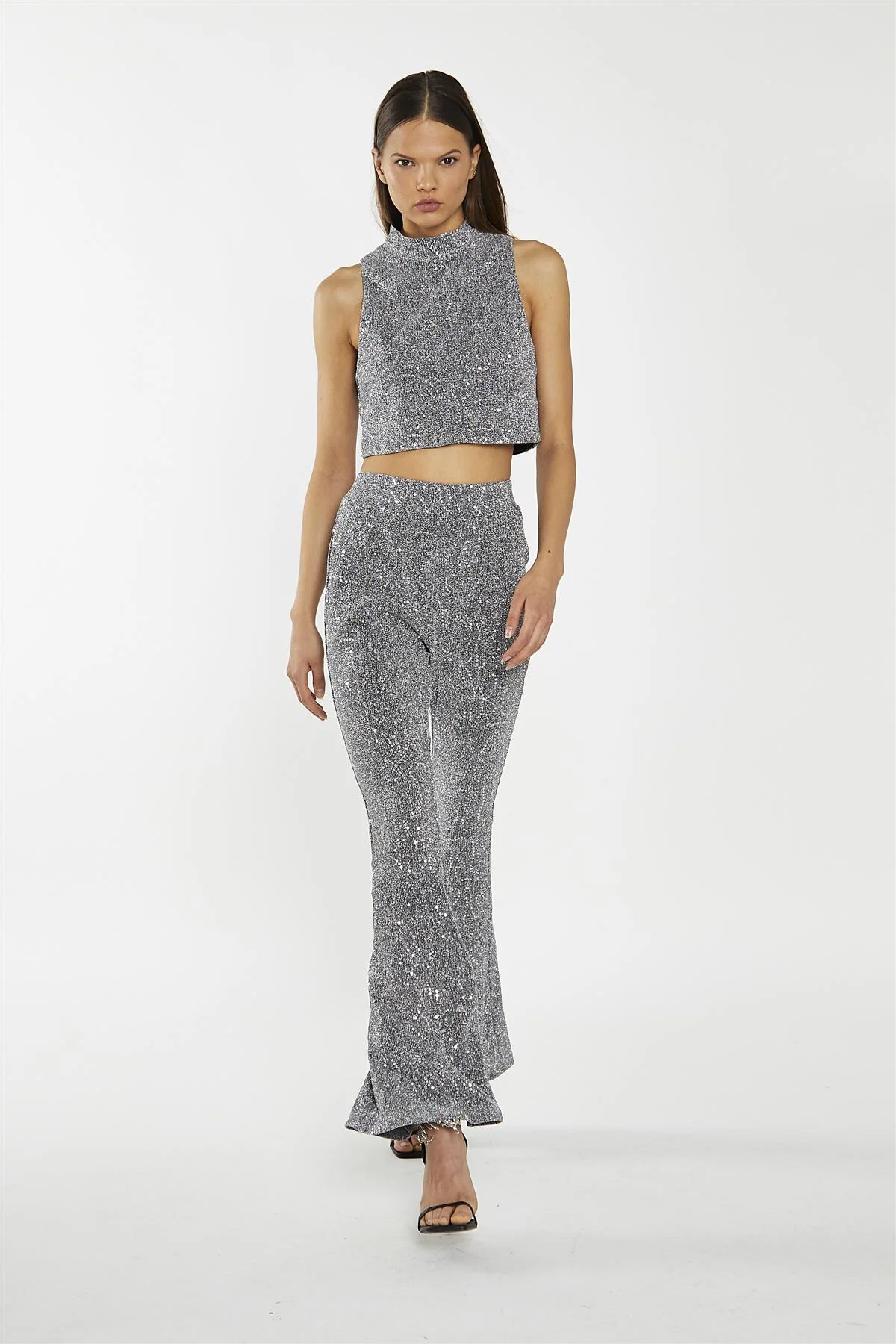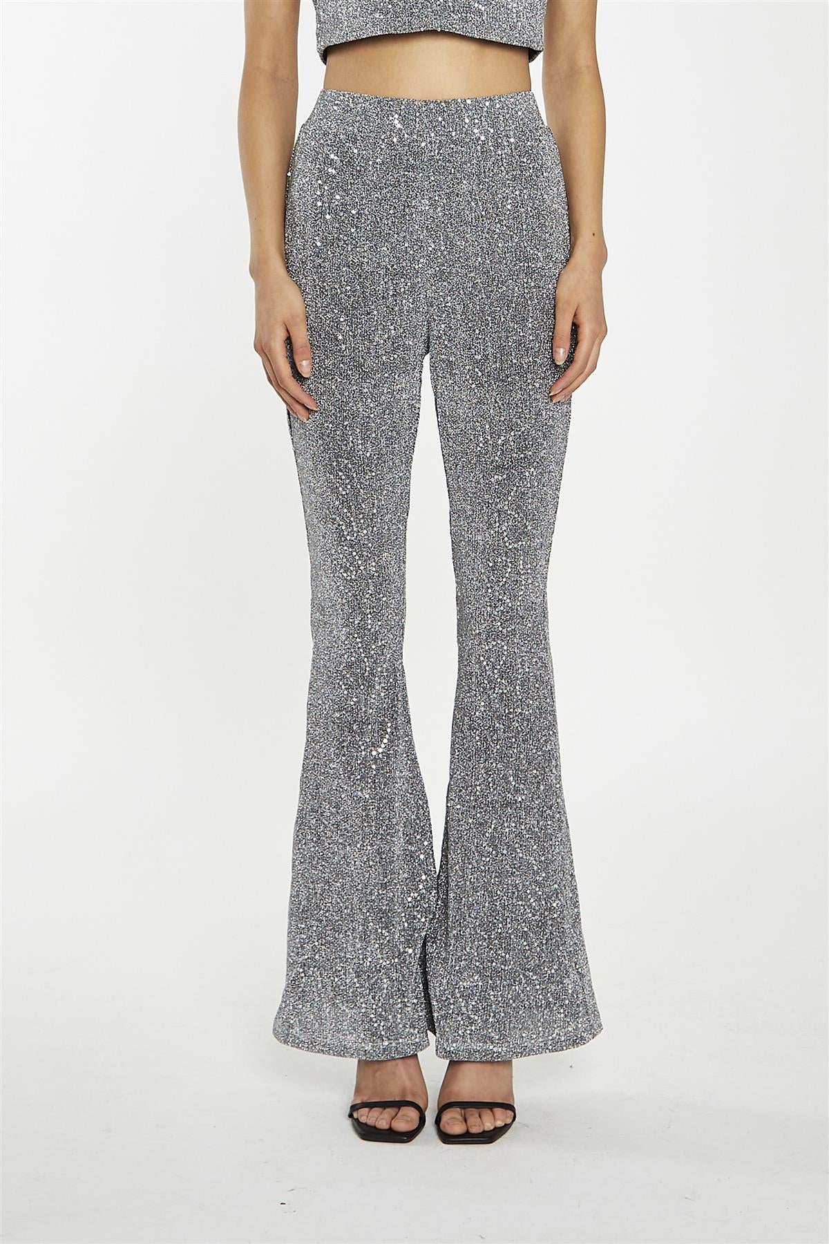 Silver-Sequin Plisse Flared-Trousers