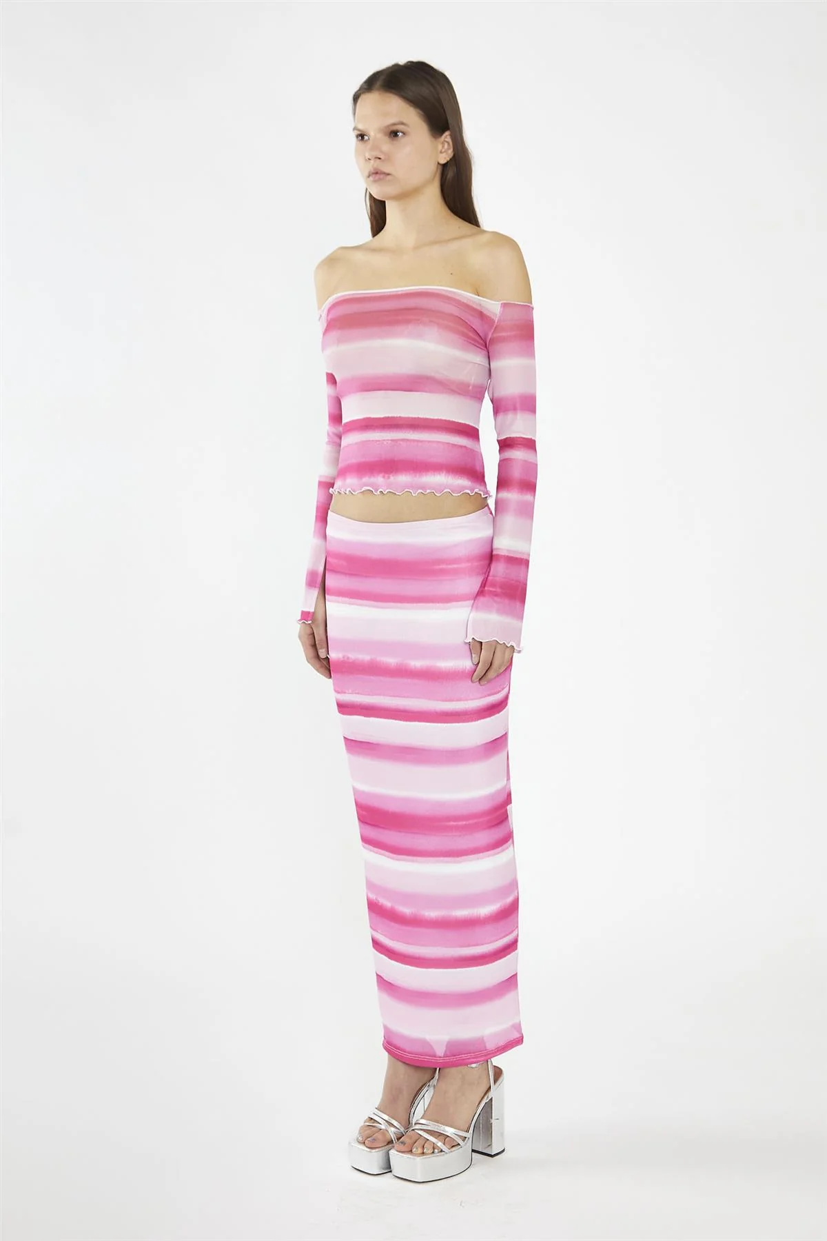 Pink Ombre-Stripe Mesh Off the Shoulder -Top