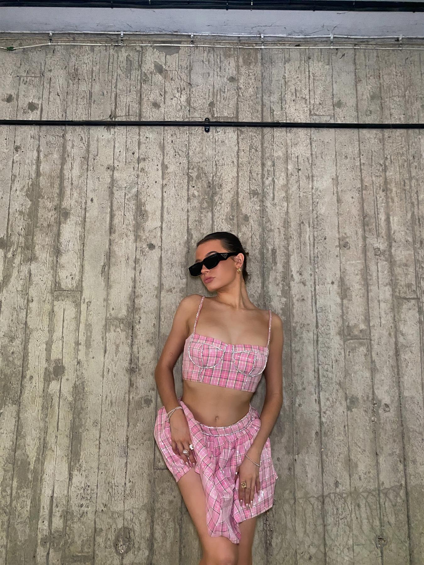 Cher Co-ord Diamante Trim Crop Top - Pink Check Sequin