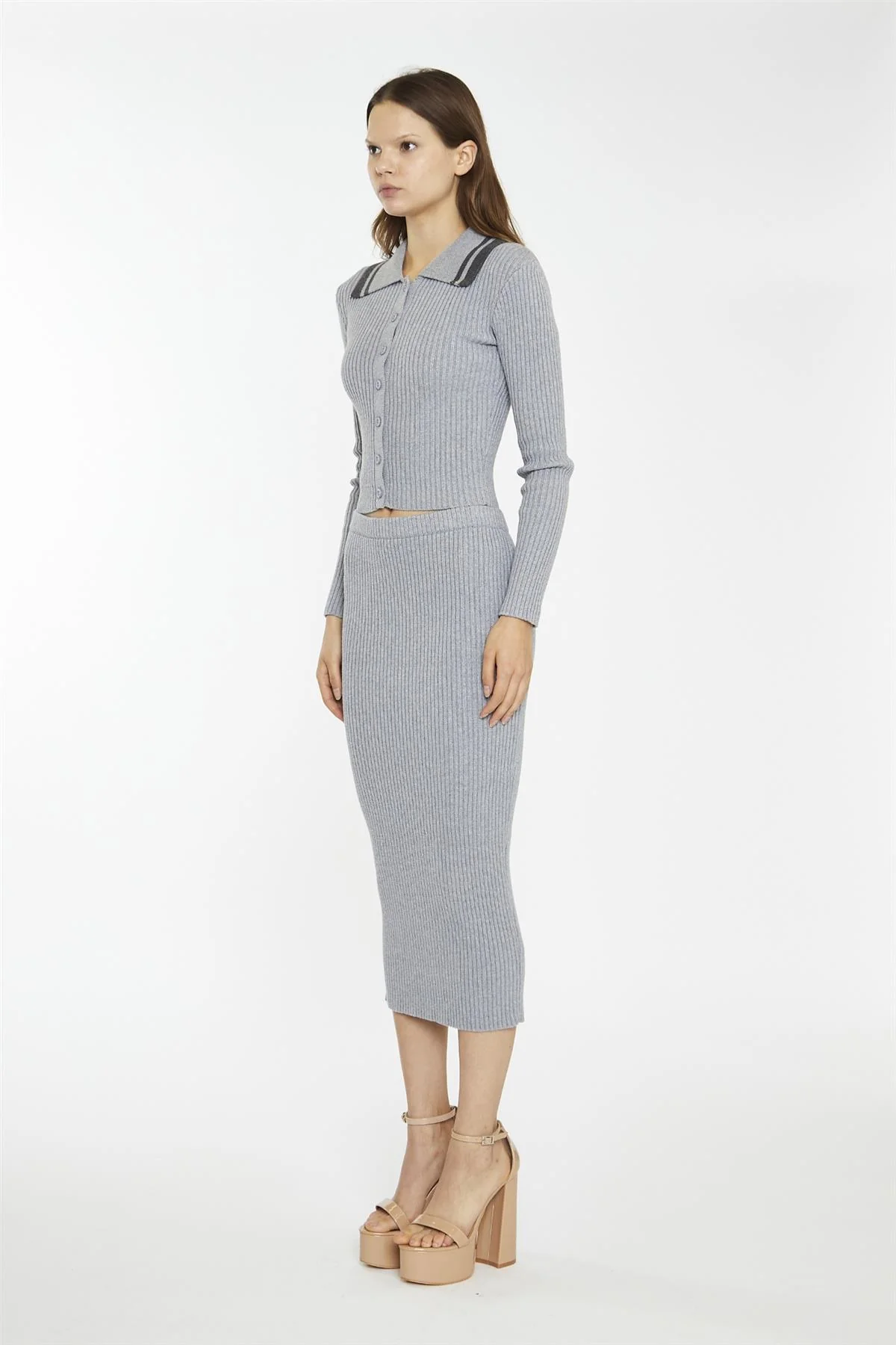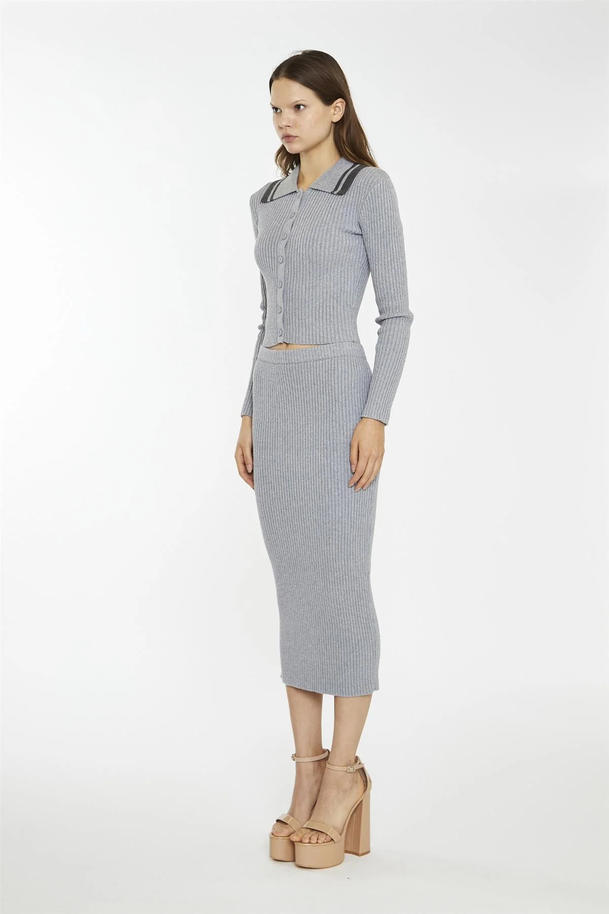 Grey-Marl Rib-Knit Midi-Skirt
