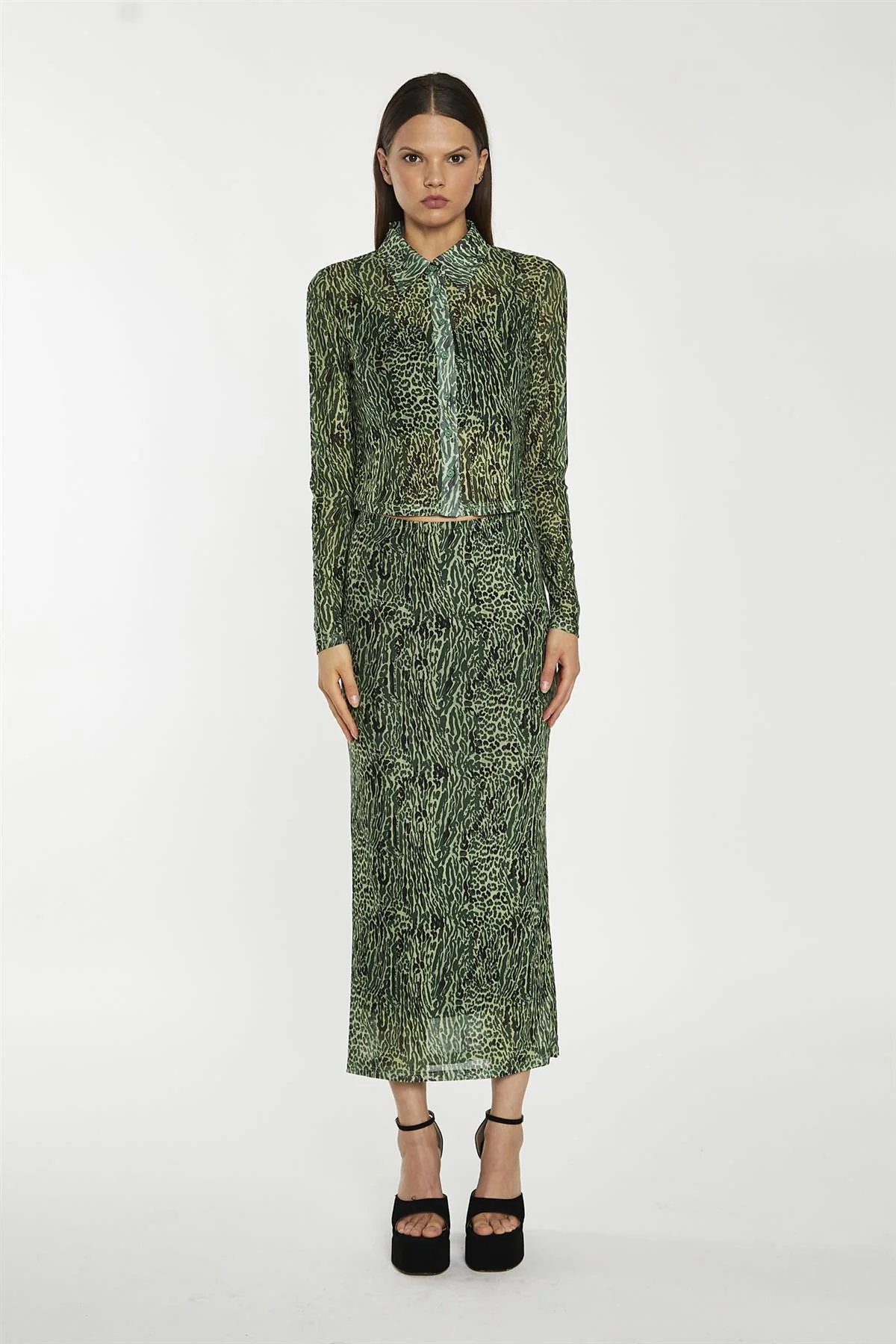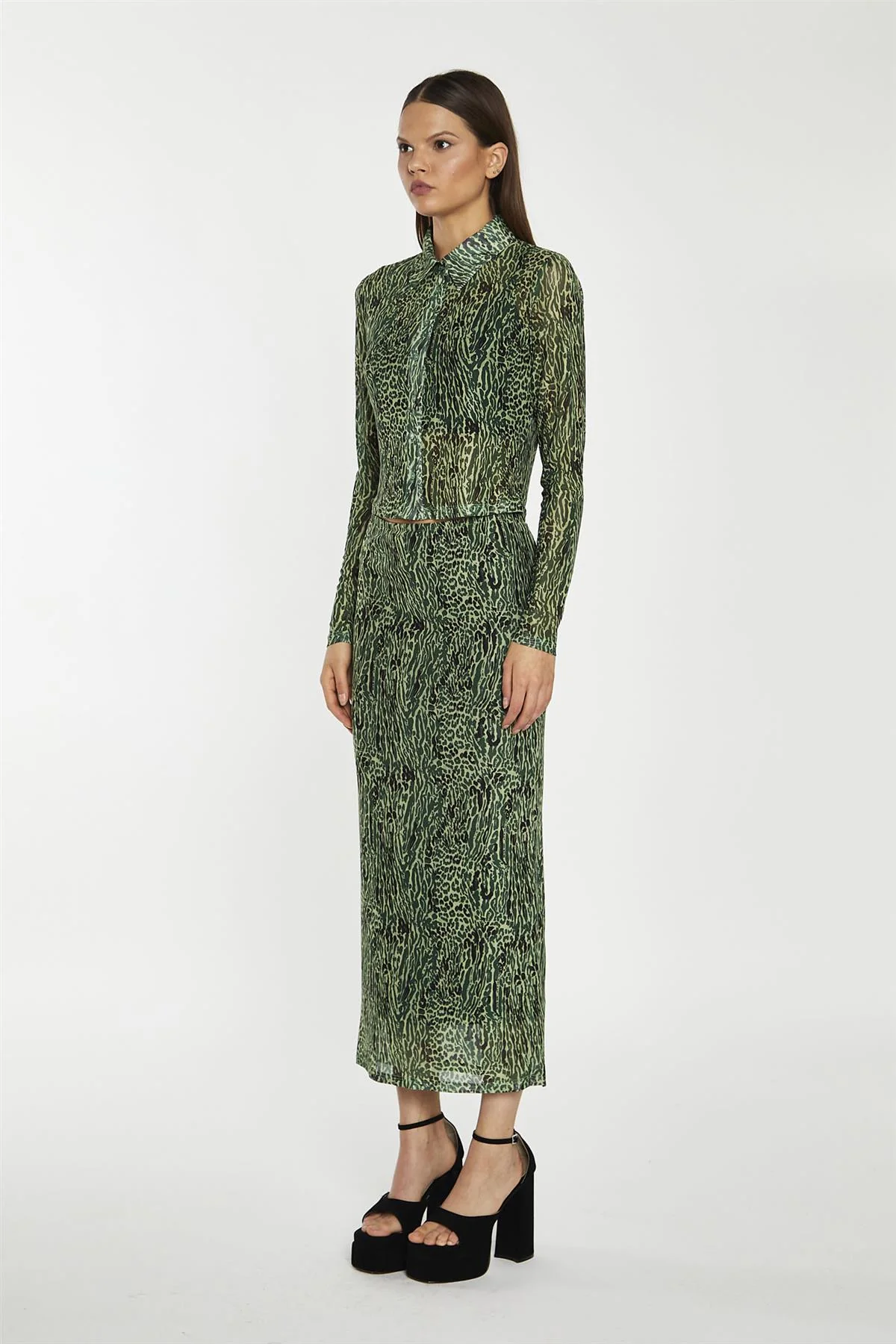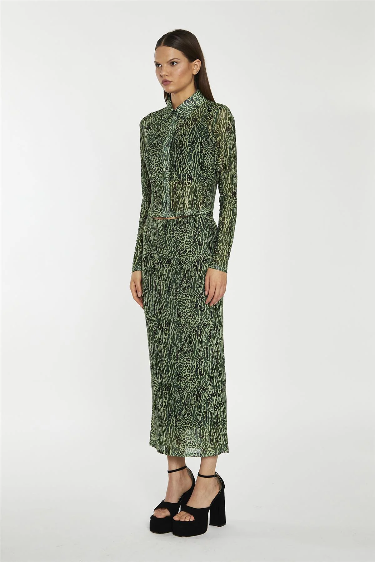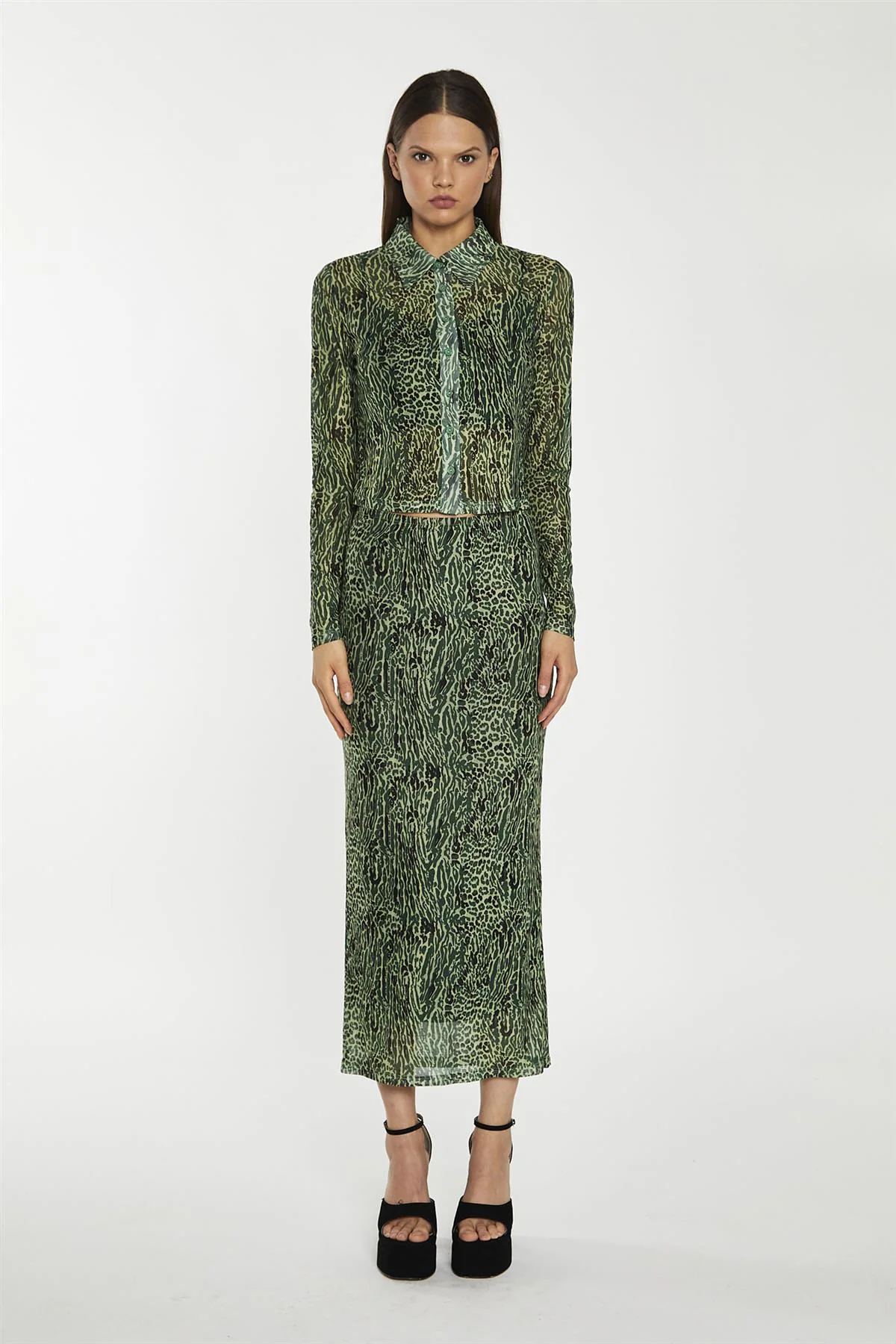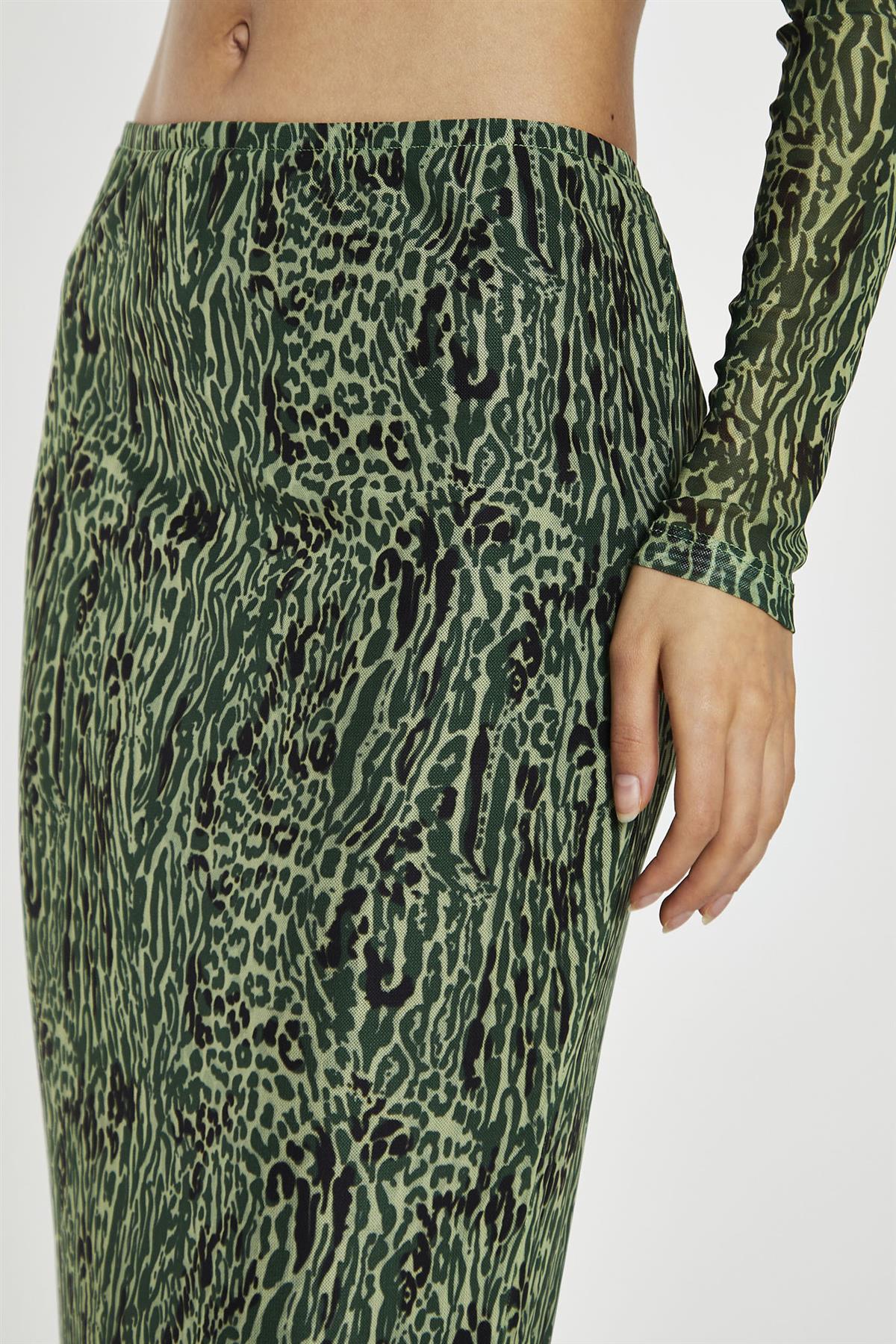 Green-Black Animal Mesh Pencil Midi-Skirt