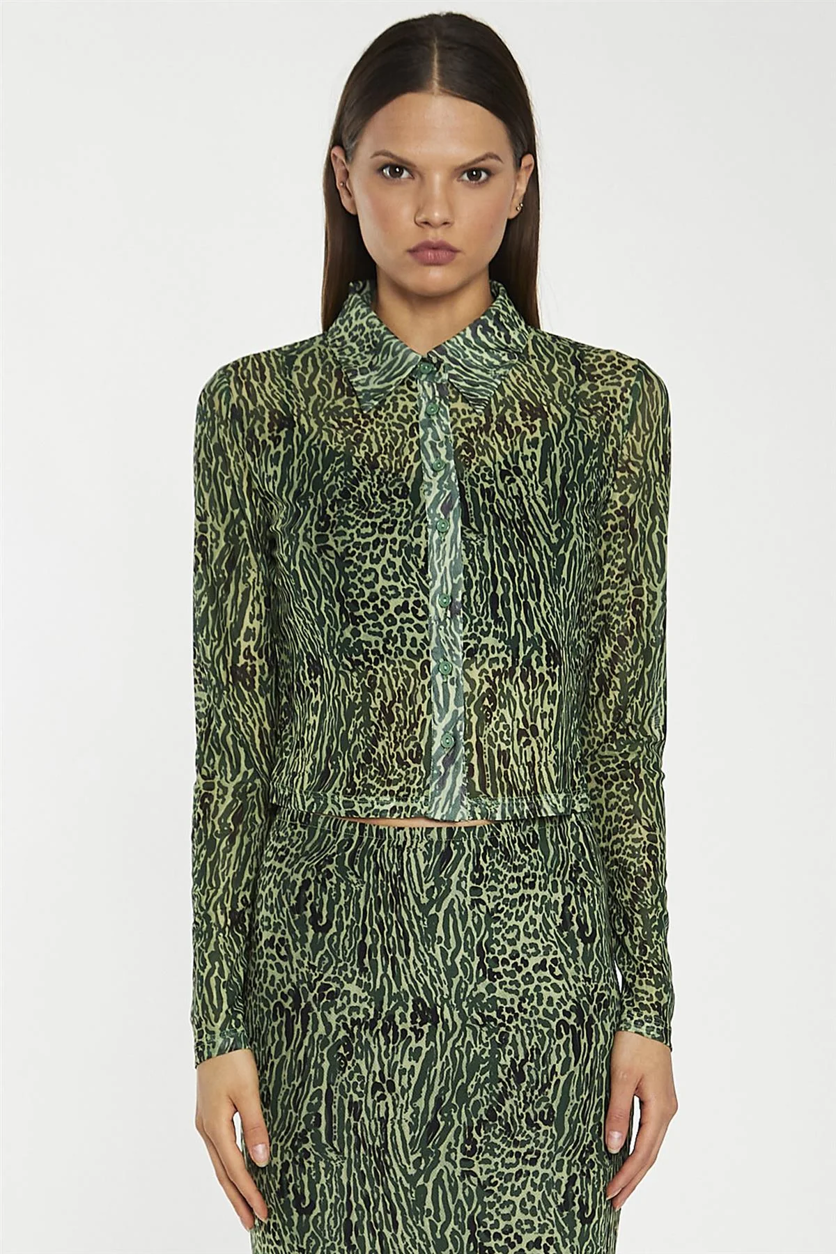 Green-Black Animal Mesh Skinny Fit Shirt