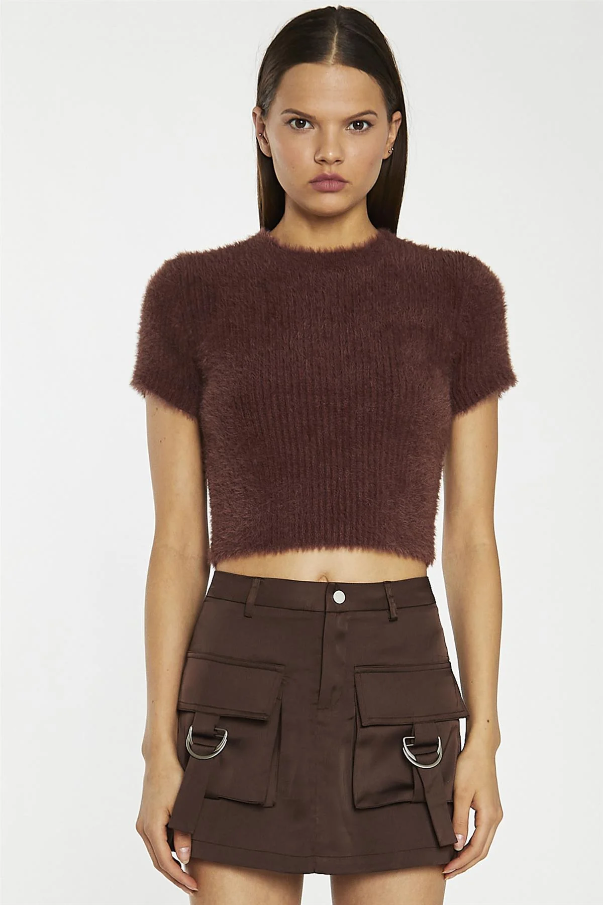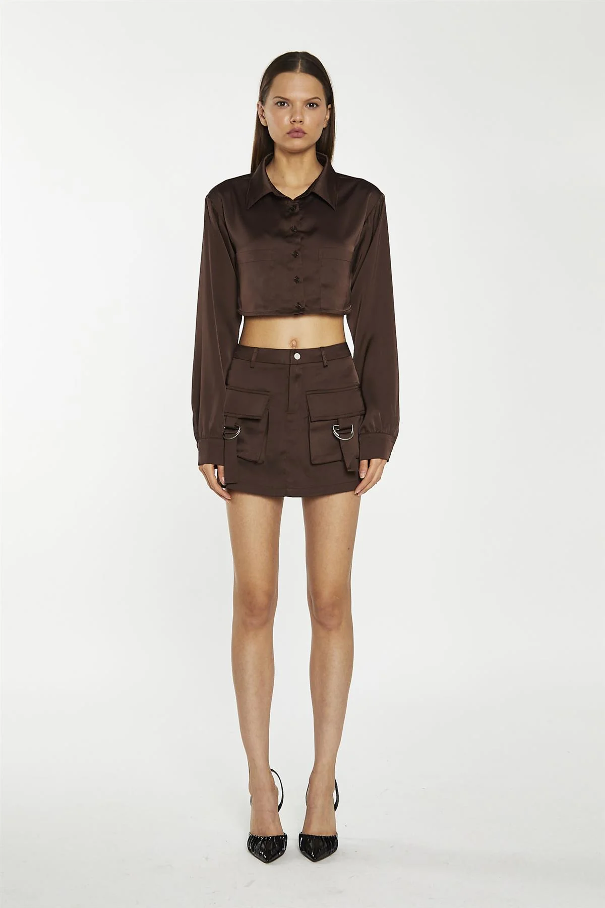 Brown Satin Cargo Mini-Skirt