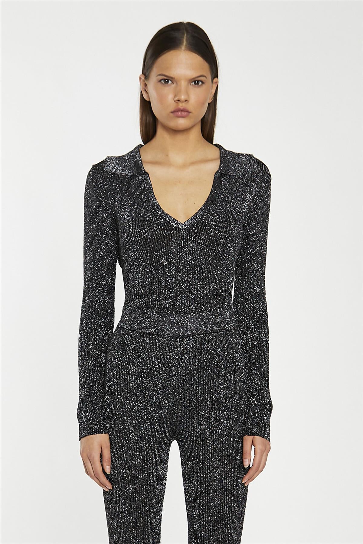 Black-Silver Rib Collared V-Neck -Bodysuit