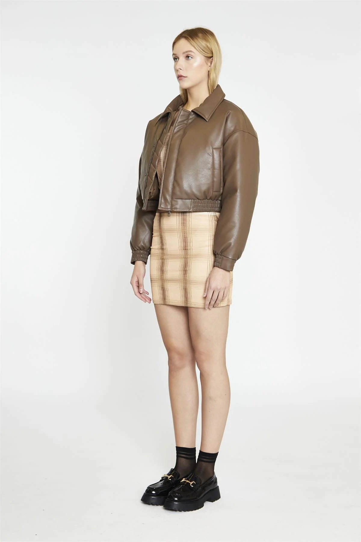 Peanut-Brown Cropped Bomber Jacket