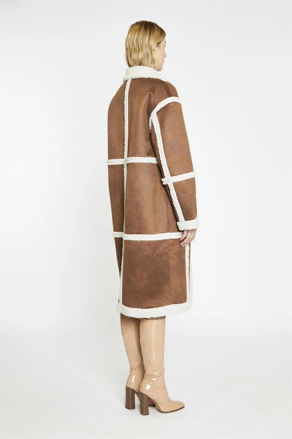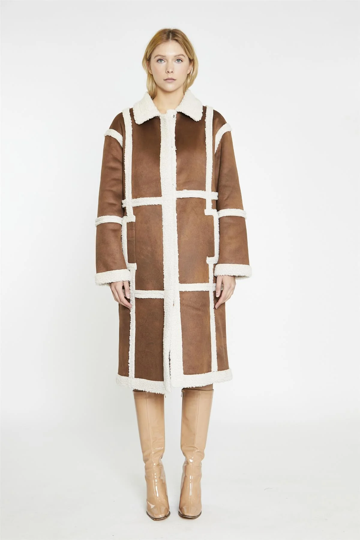 Tan-Cream Shearling Midi-Coat