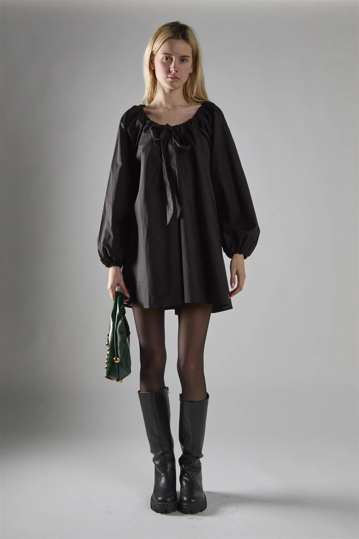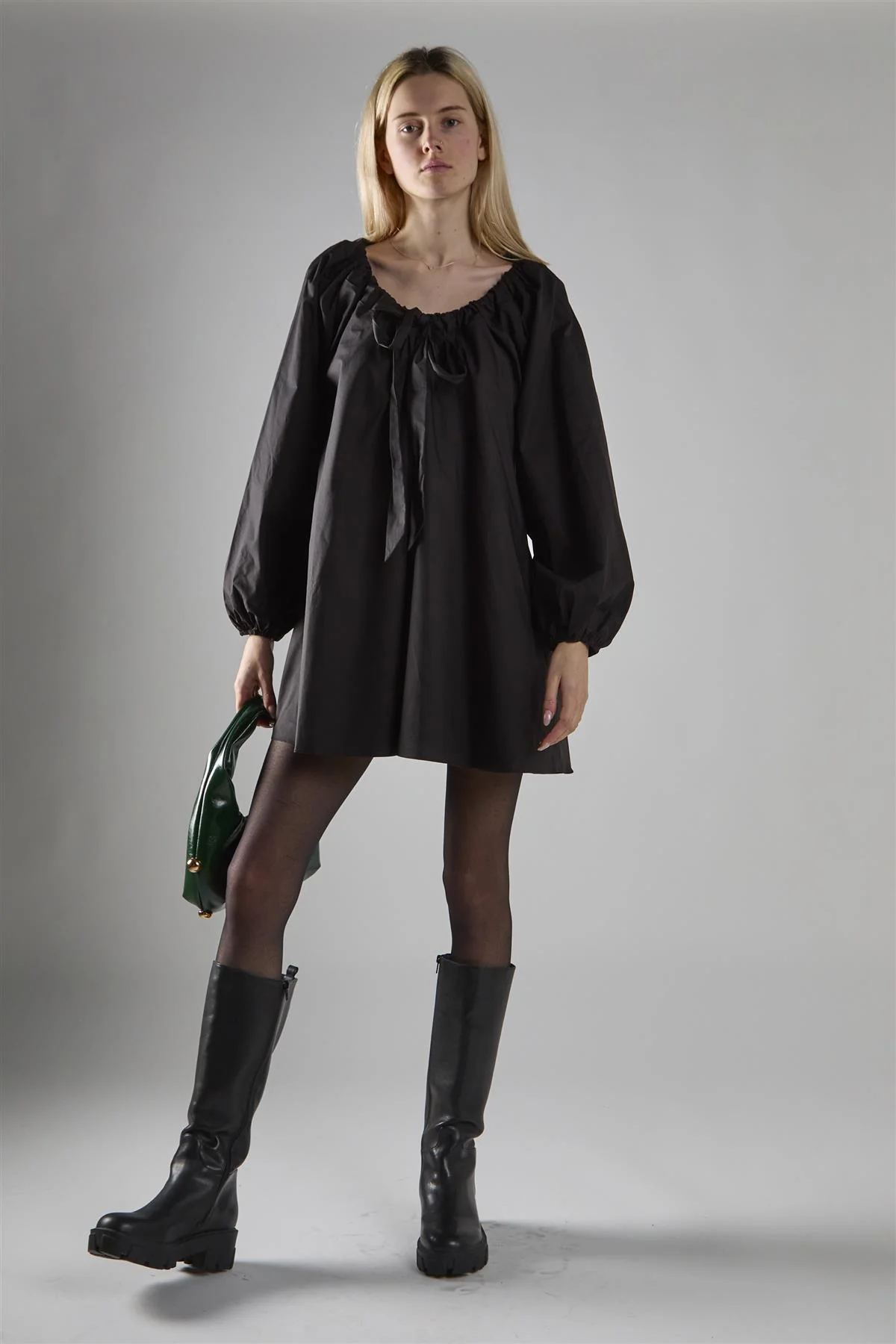 Black Long-Sleeve Tie Detail Mini-Dress