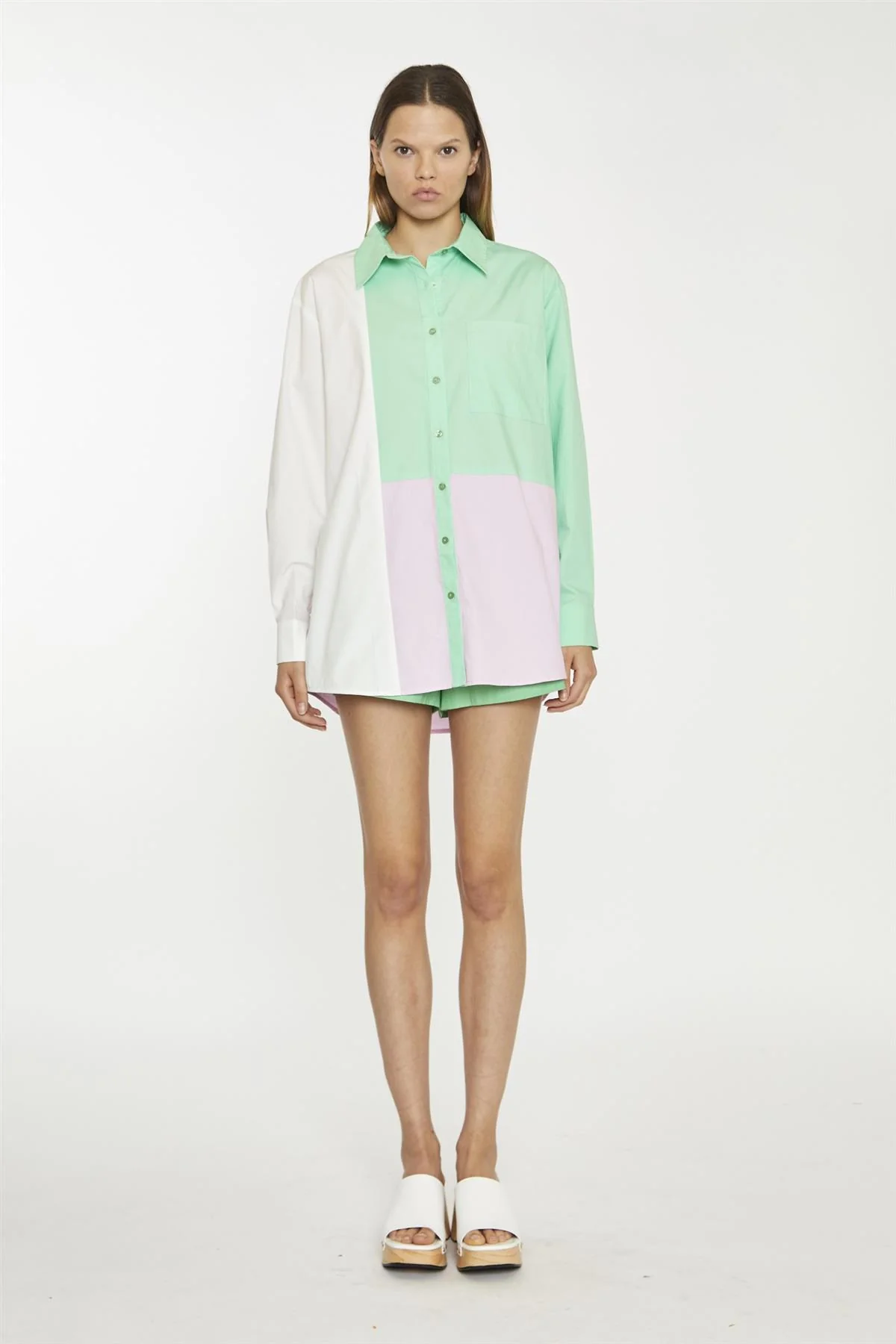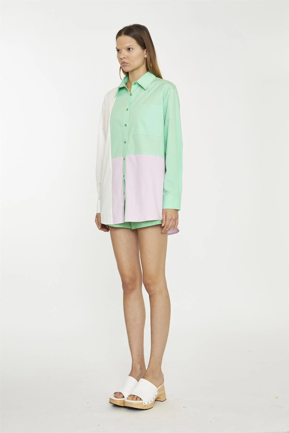 White Green Pink Colour Block Long-Sleeve-Top