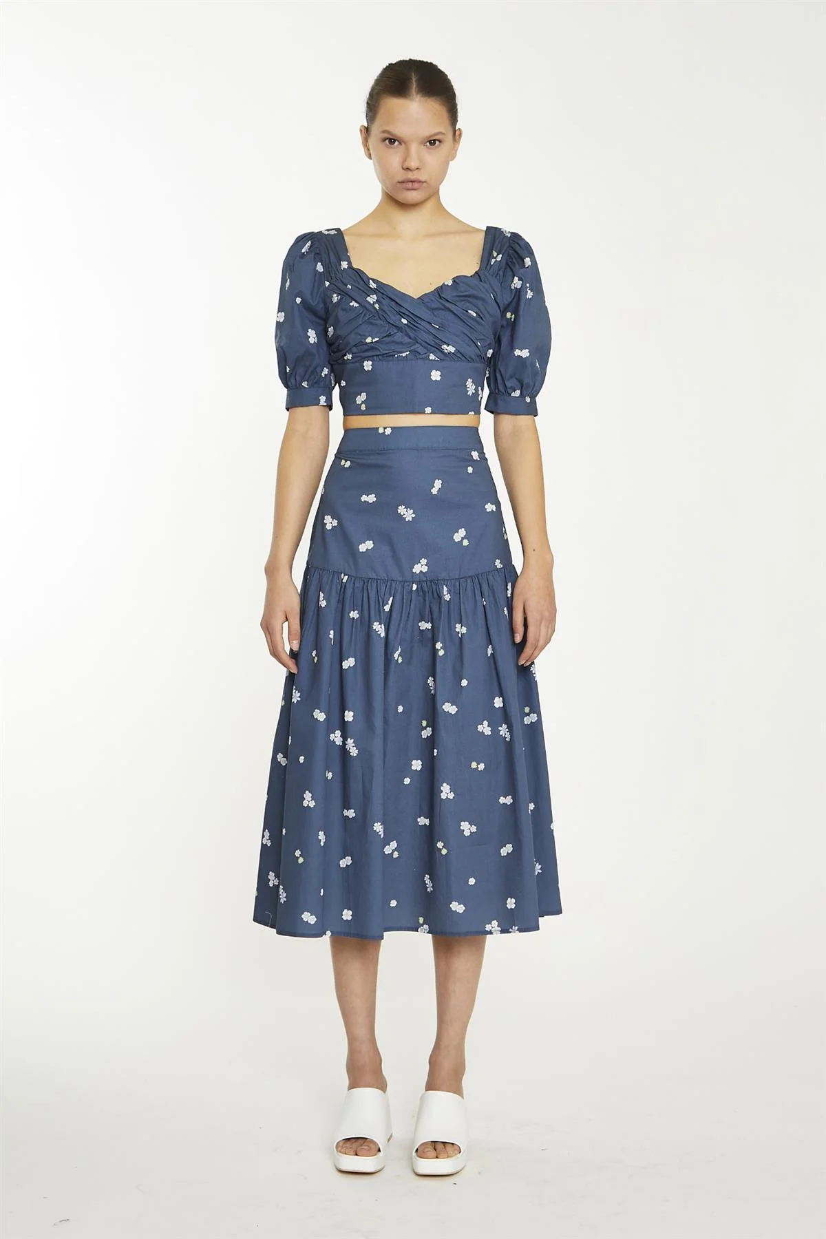 Navy Scattered Flower Sweetheart Neckline Crop-Top