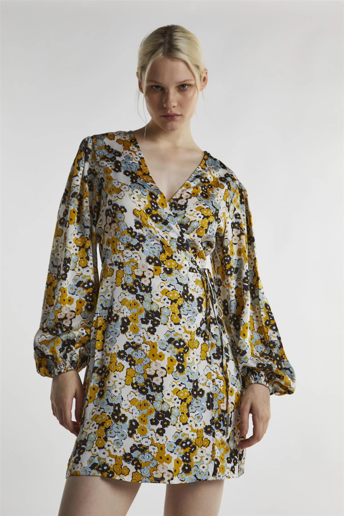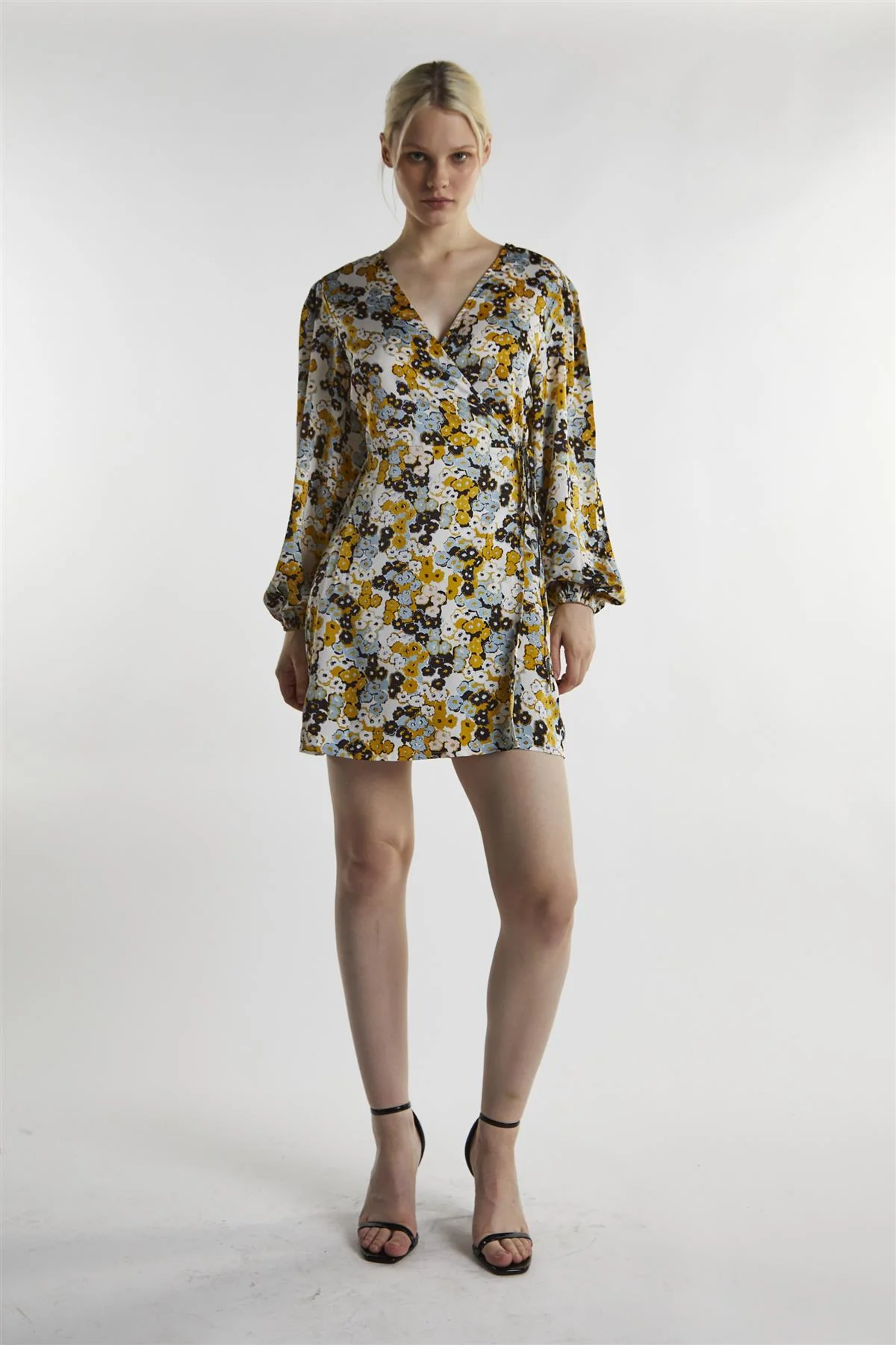 Mustard-Floral Wrap Mini-Dress