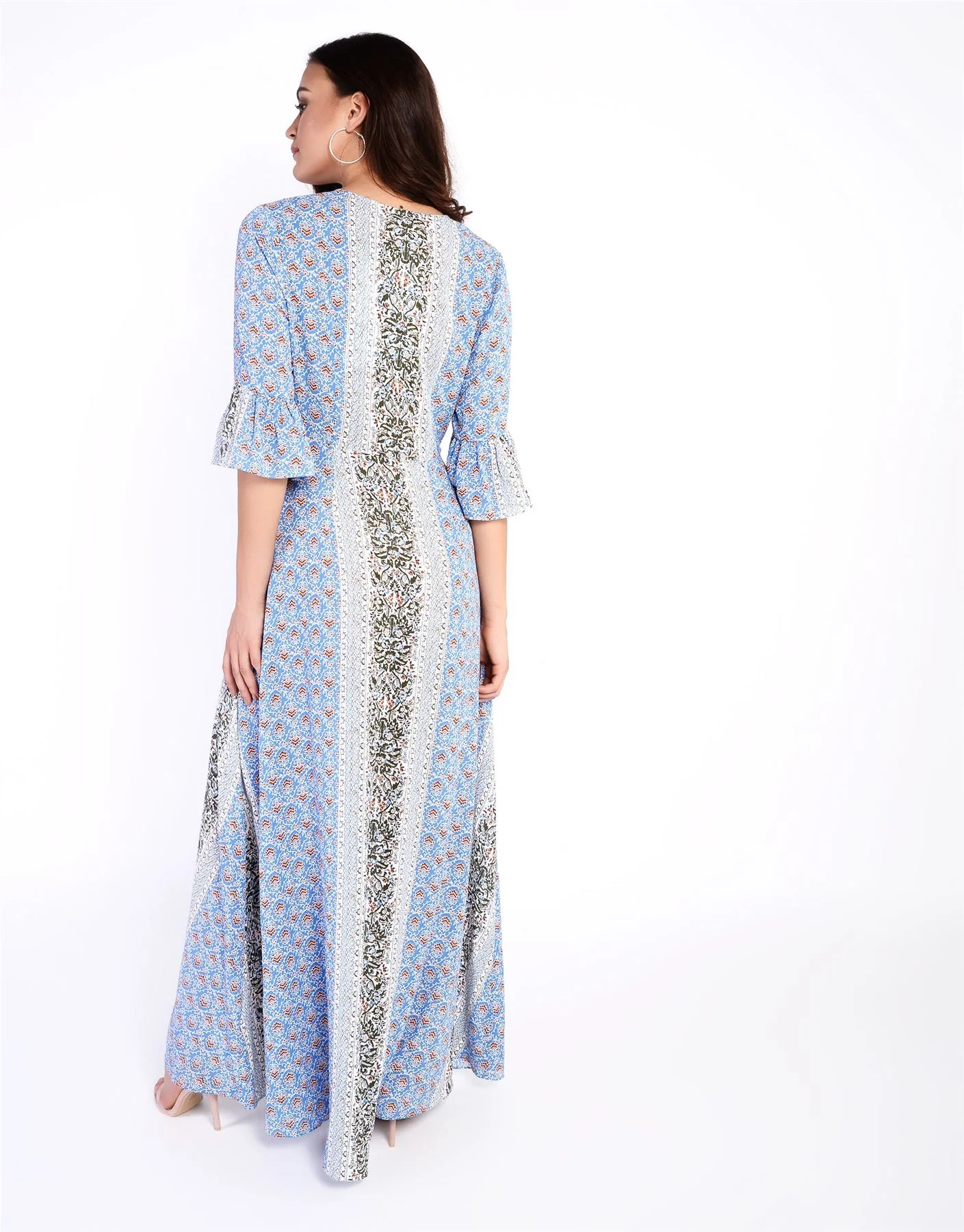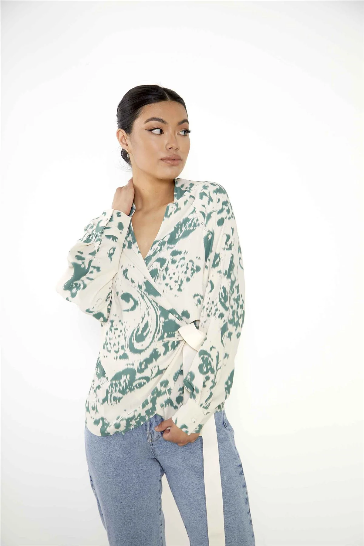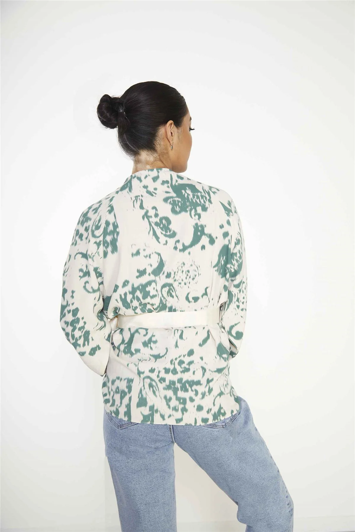 Cream Green Abstract Oversized Blouse with Wrap Tie