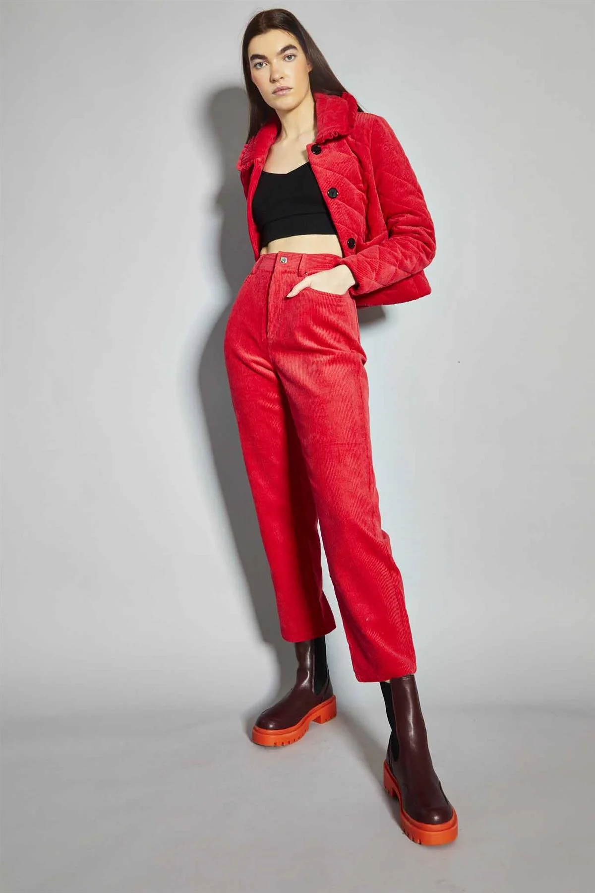 Lollipop-Red Corduroy Collared Padded-Jacket