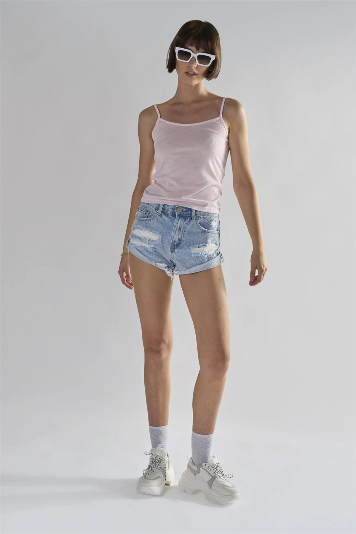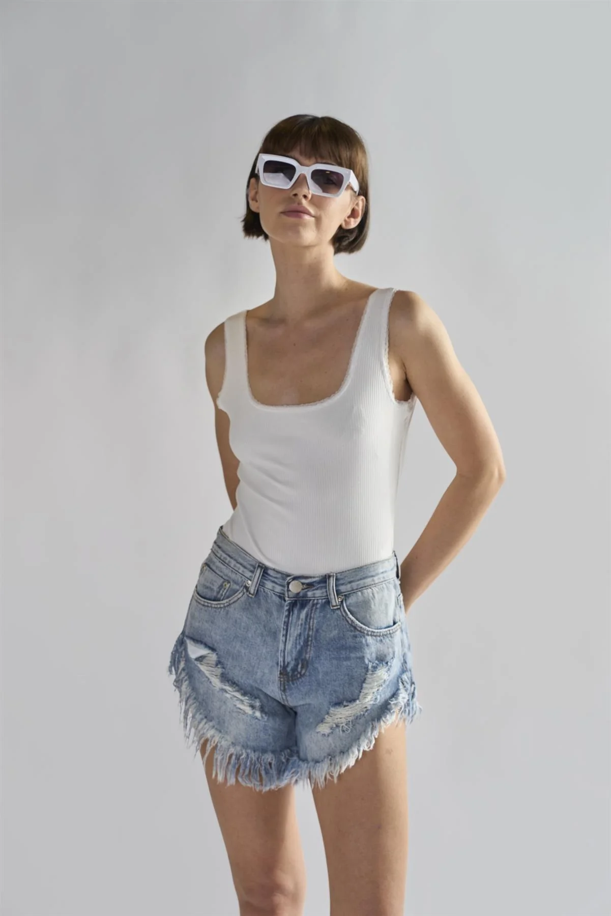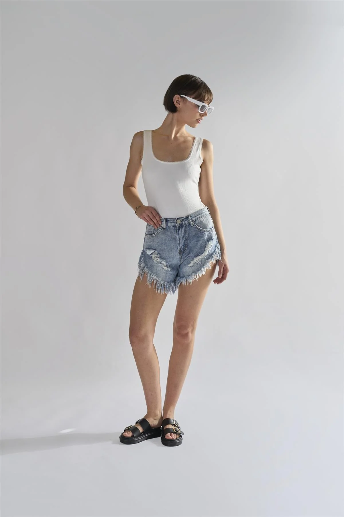 Antique-Wash High-Waisted Distressed Denim-Shorts