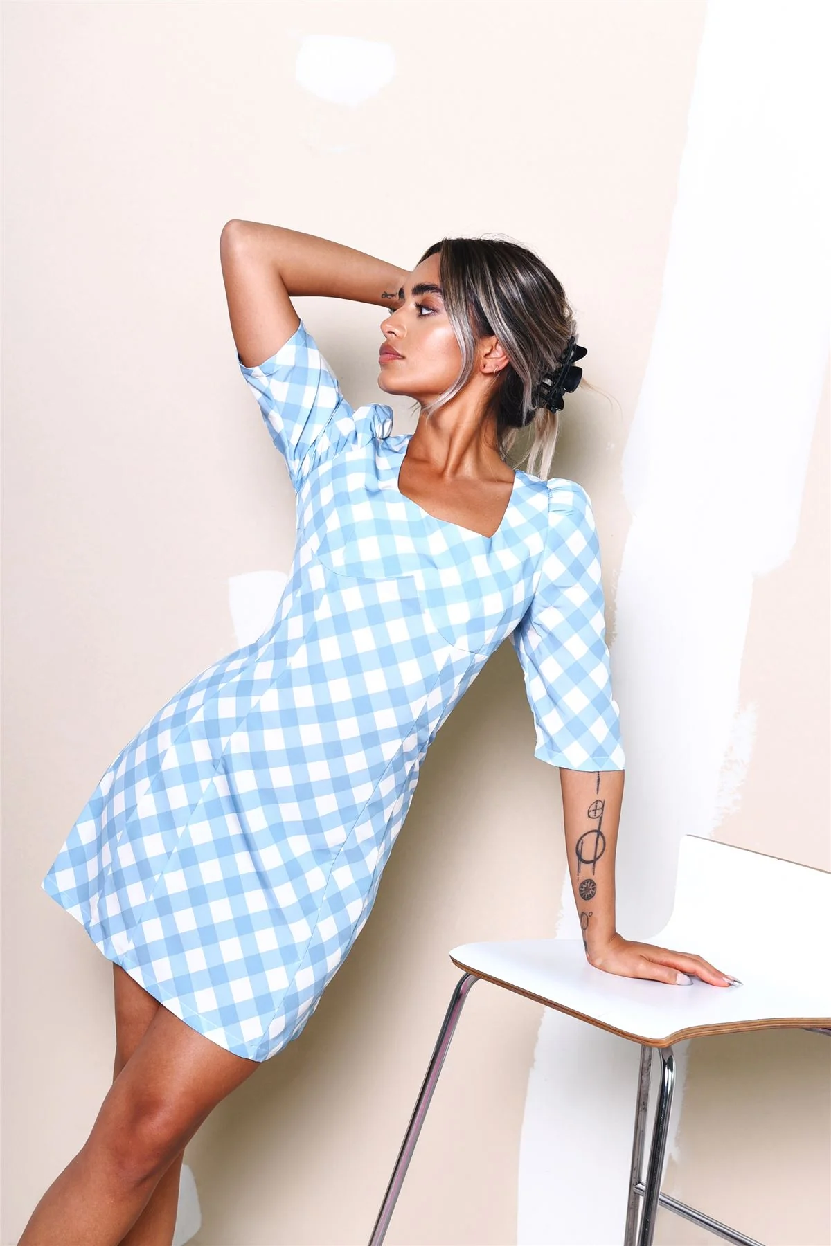 Blue Check Square Neck Long Sleeve Mini Dress