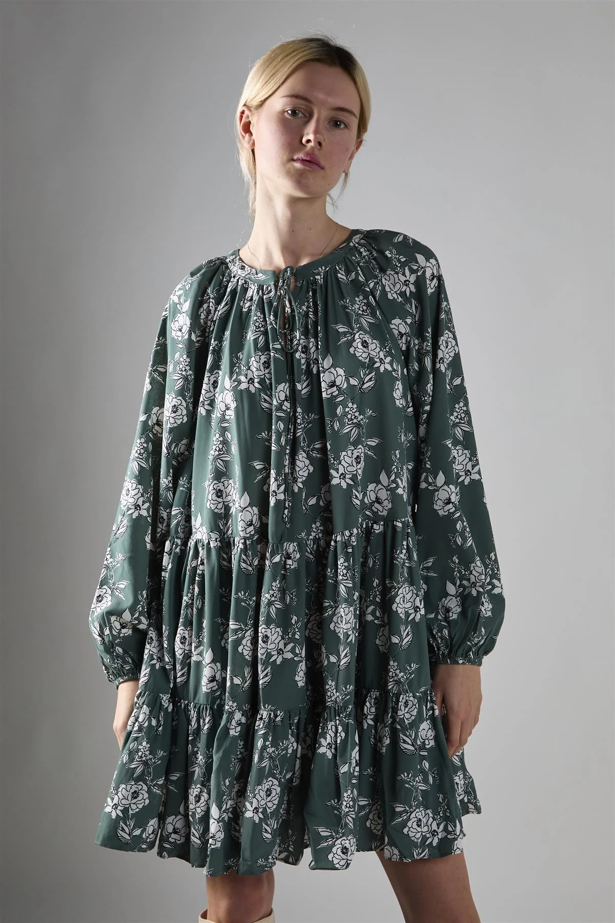 Khaki White Floral Poplin Tiered Mini-Dress