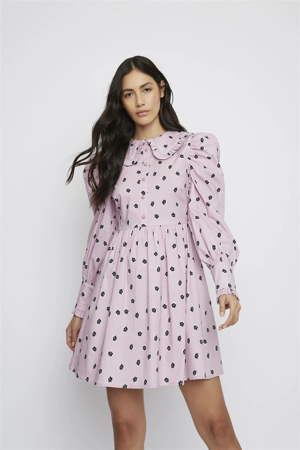 Pink Ditsy Cotton Button-Up Collared Mini-Dress