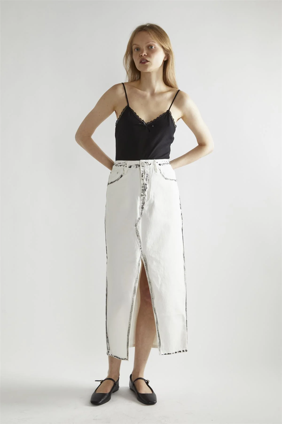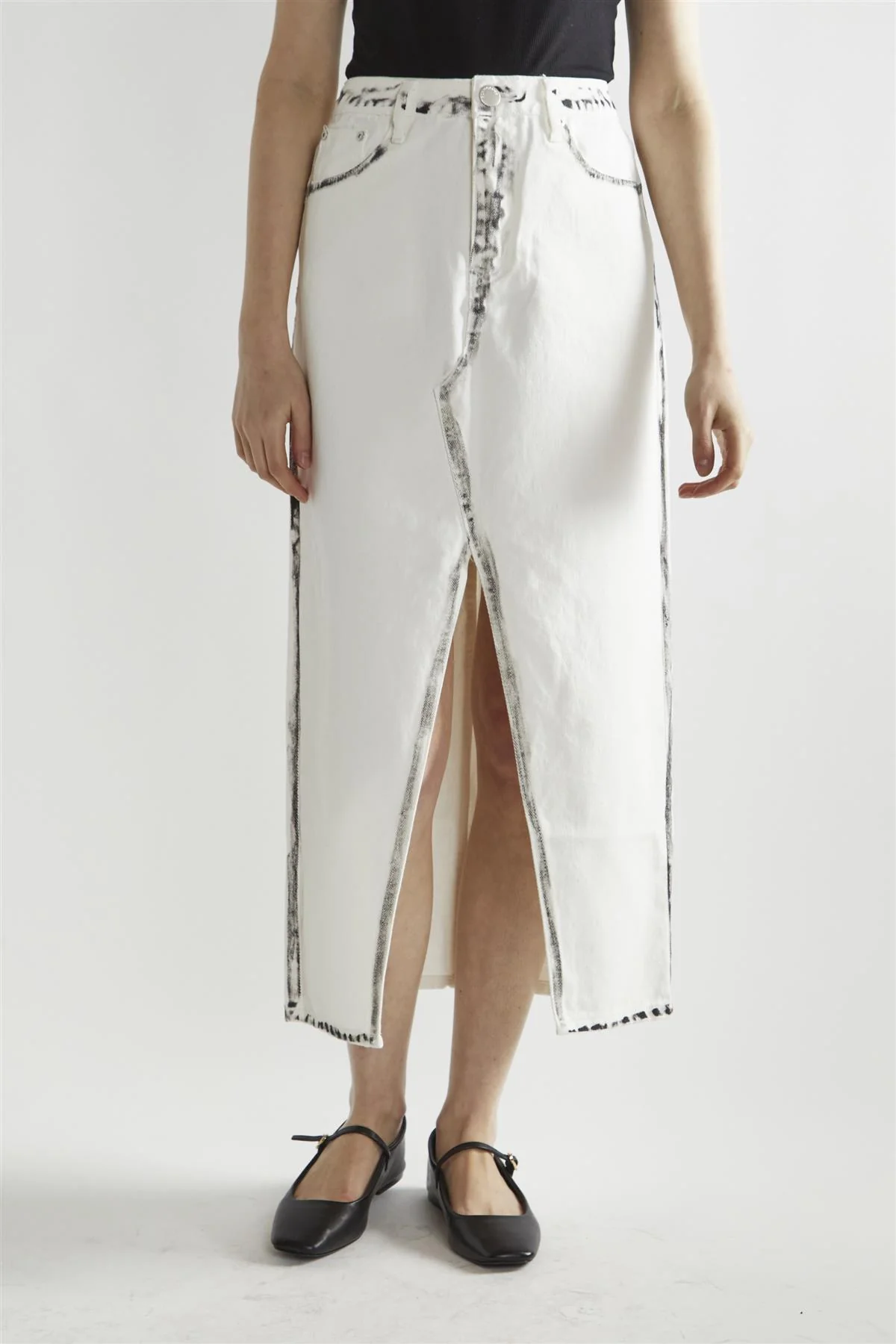 White-Black Edges Denim Straight Midi-Skirt