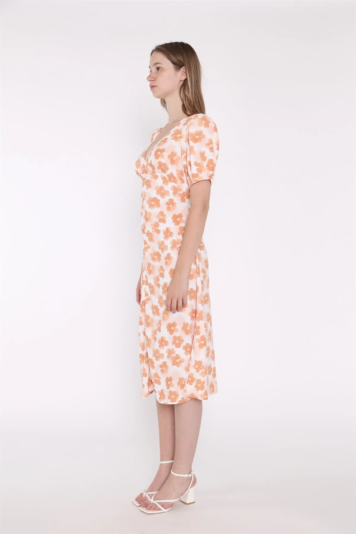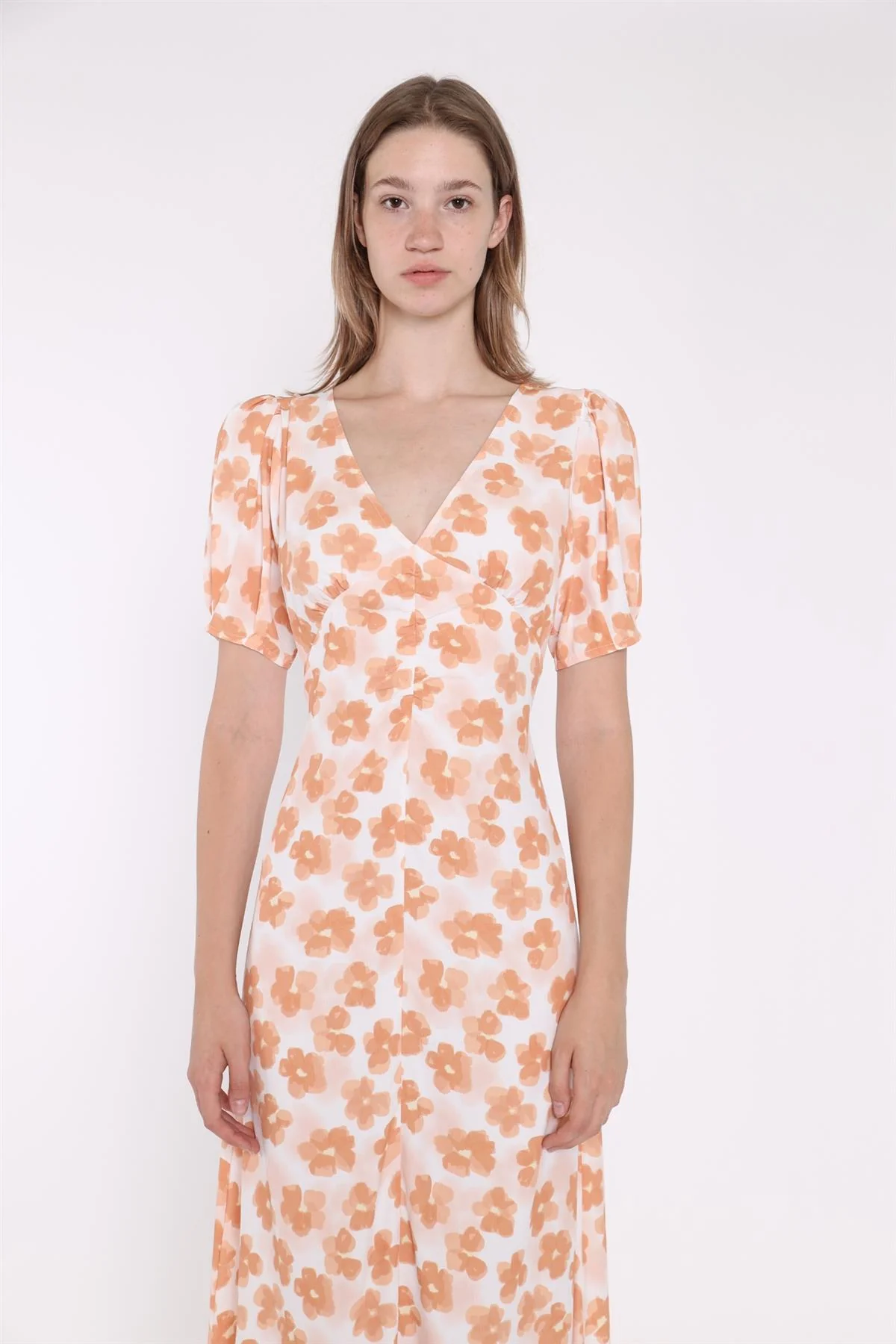 Apricot Blurred-Flower Ruched-Front Midi-Dress