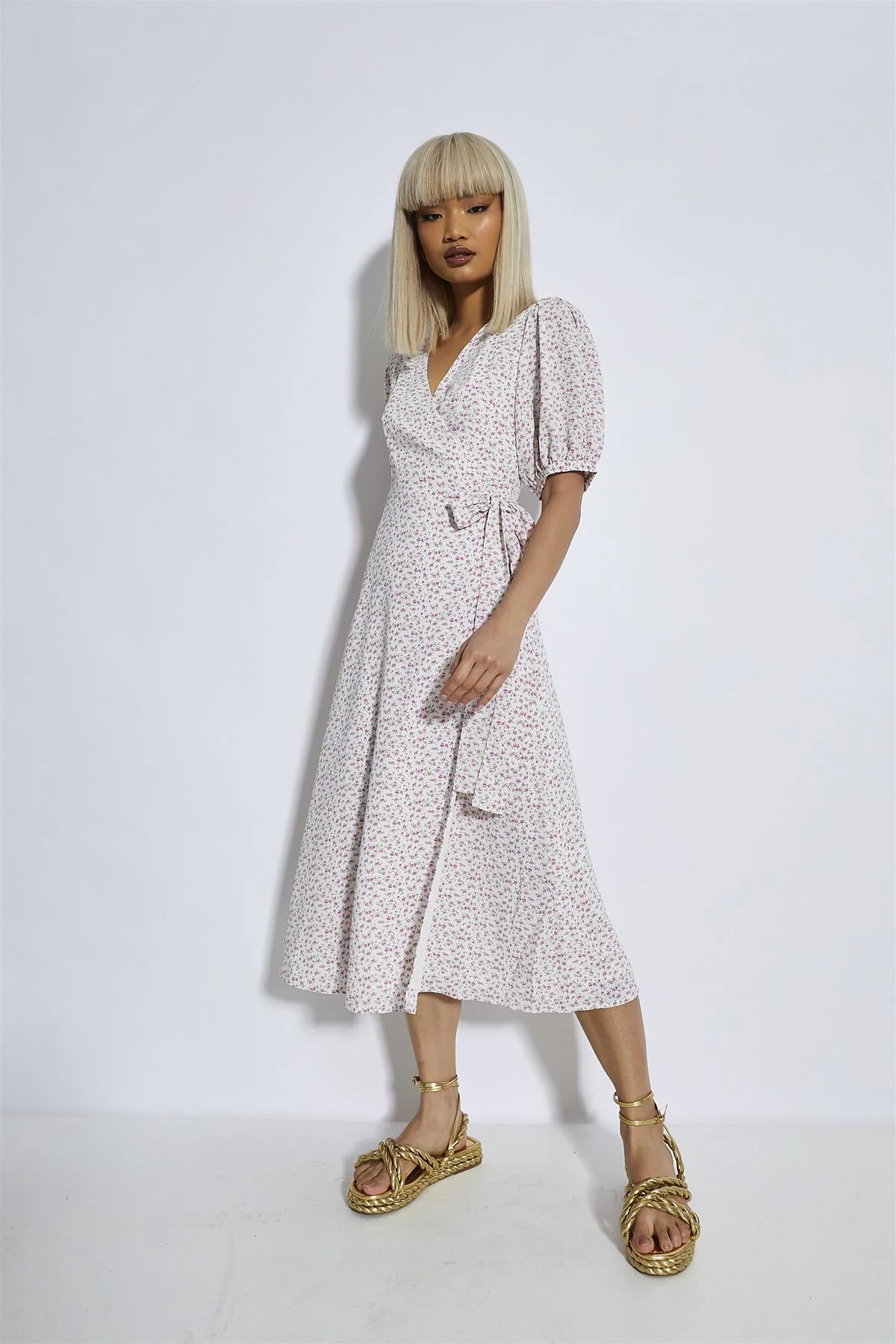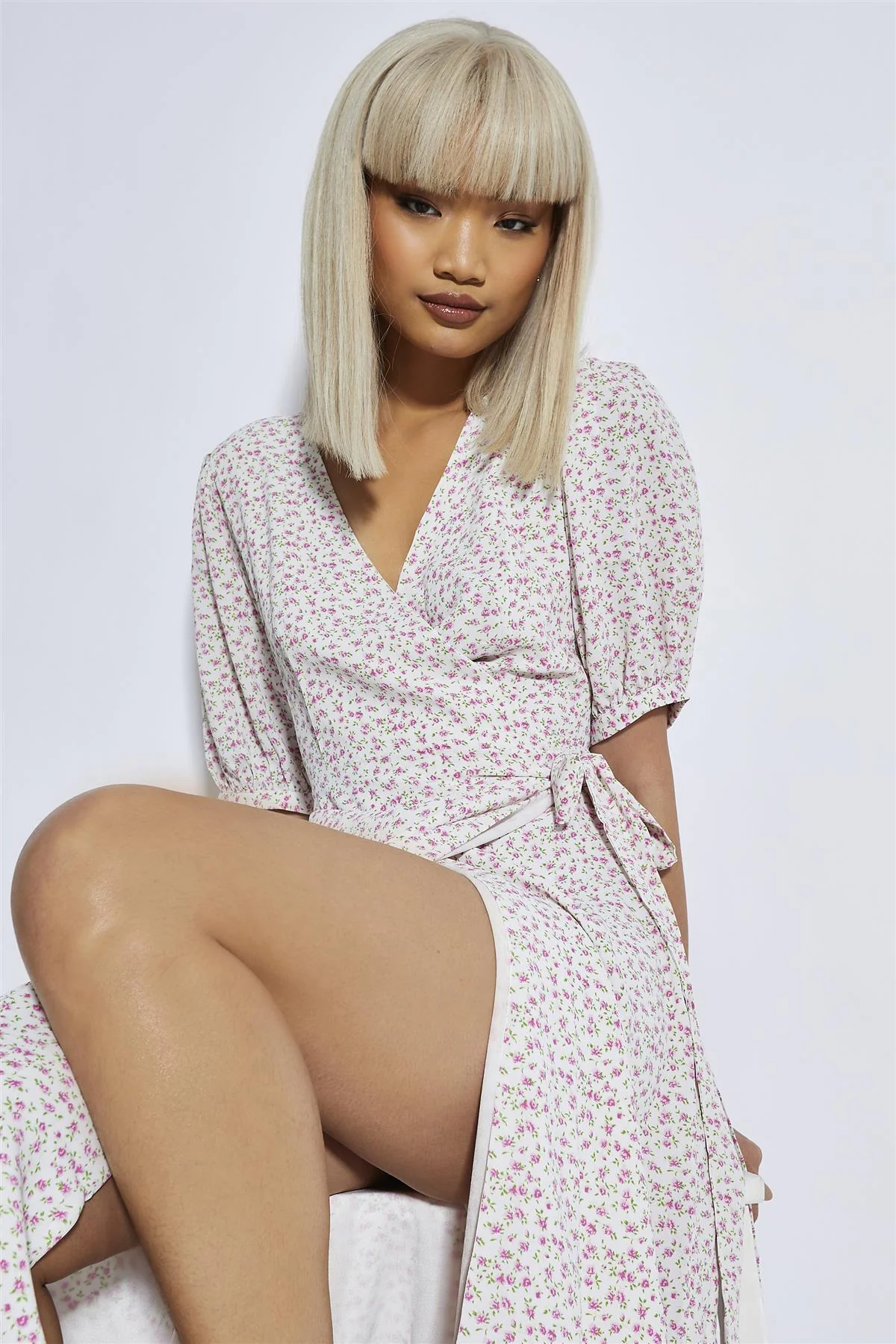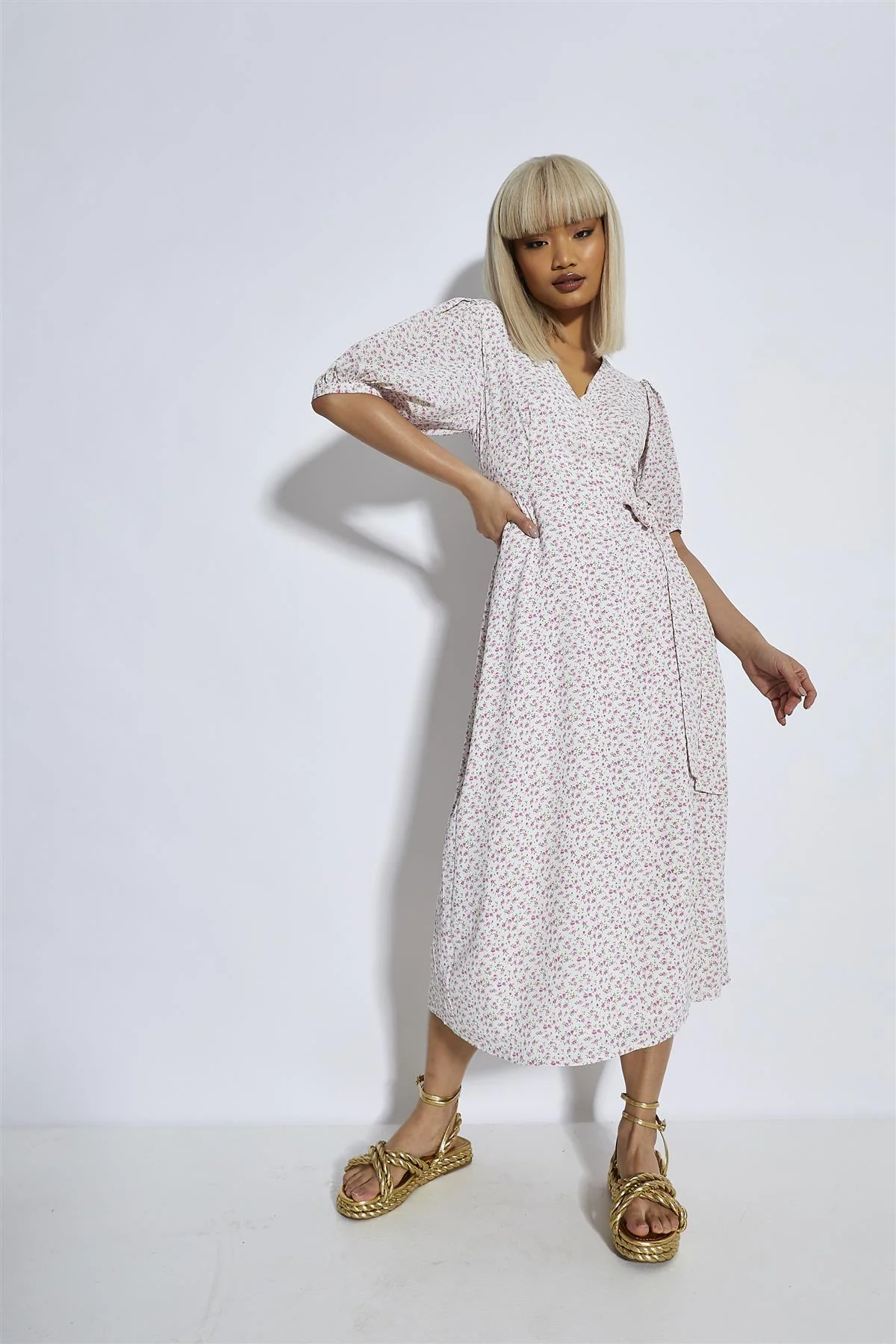 Pink Mini Vintage-Rose Midi Wrap-Dress