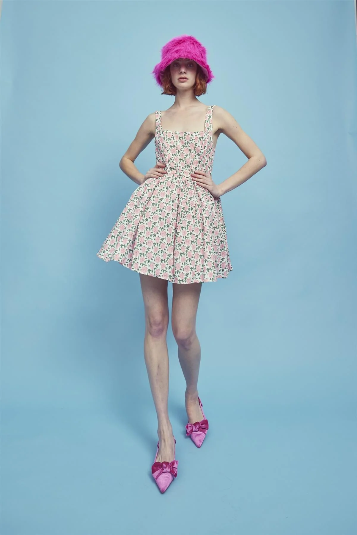 Pink Multi-Flower Fluted Sleeve Mini-Dress