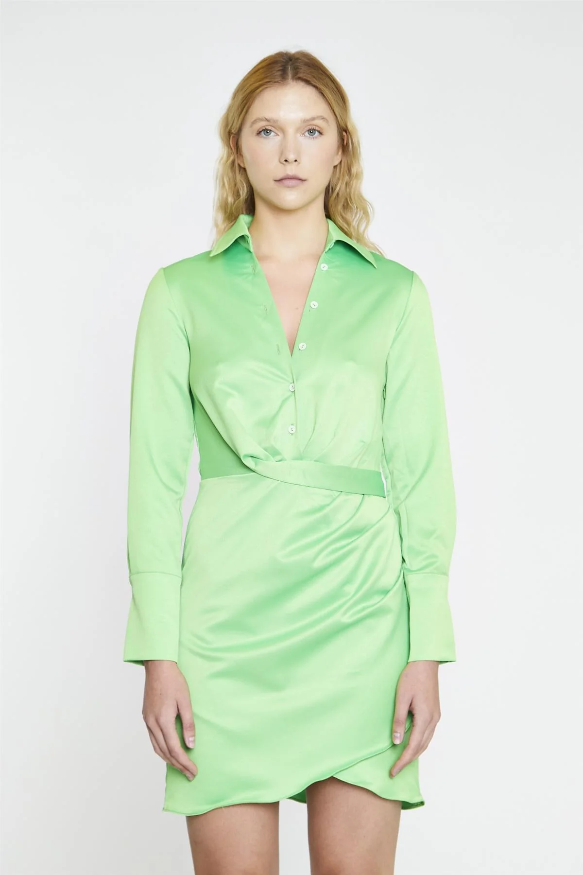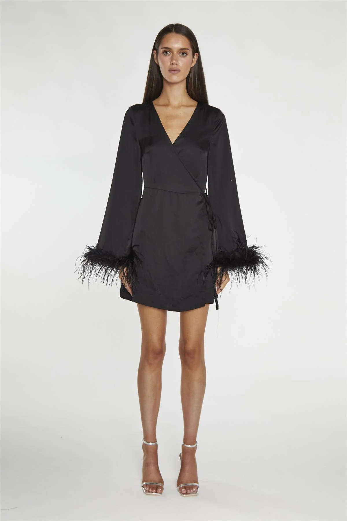 Black-Sateen Feather Trim Wrap Mini-Dress