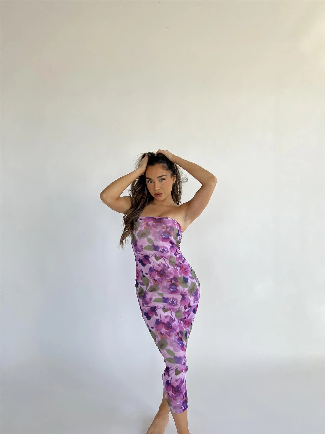 Blurred-Purple Floral Bandeau Midaxi-Dress