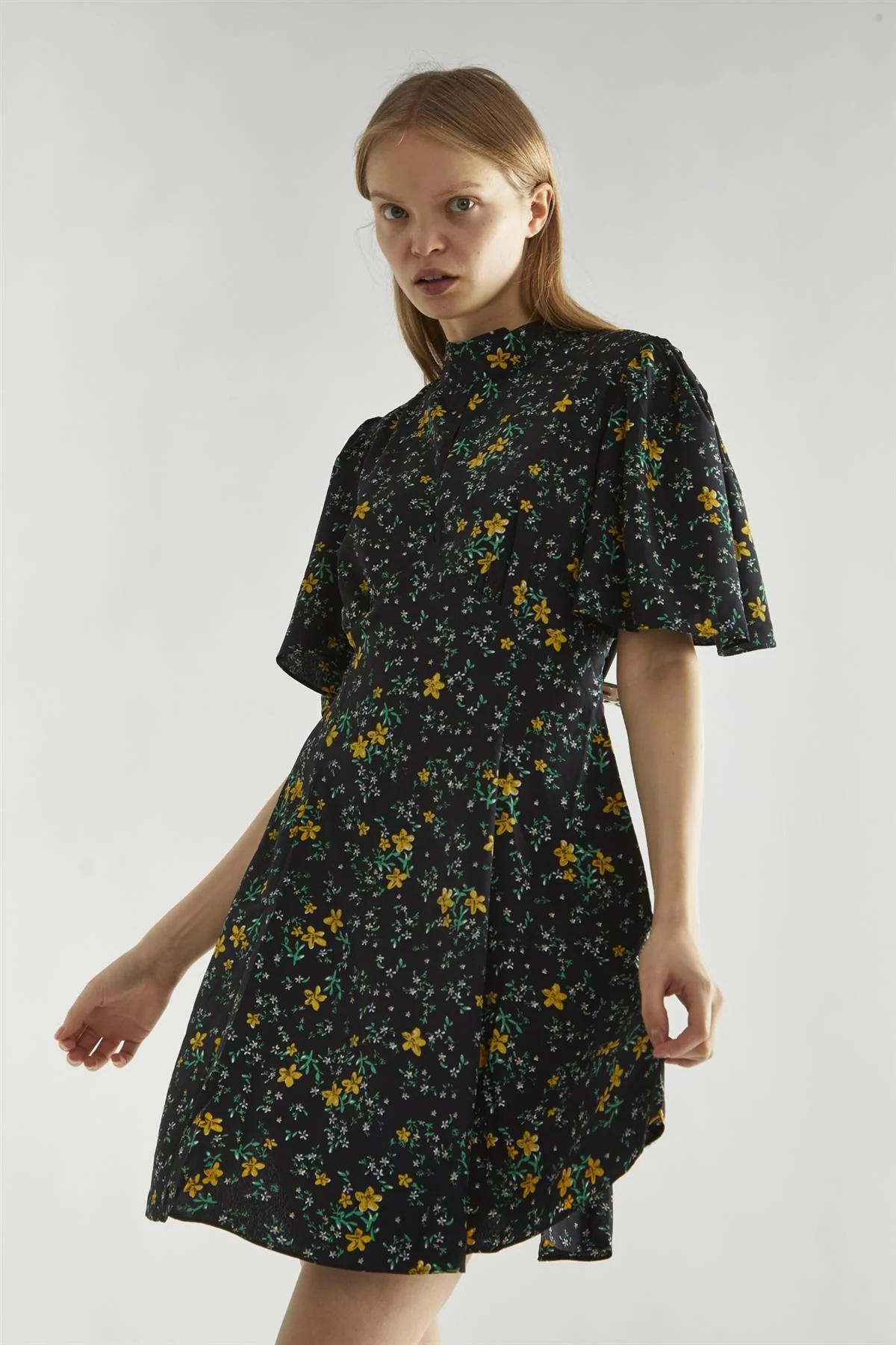 Black-Yellow Mini Floral High-Neck Mini Tea-Dress