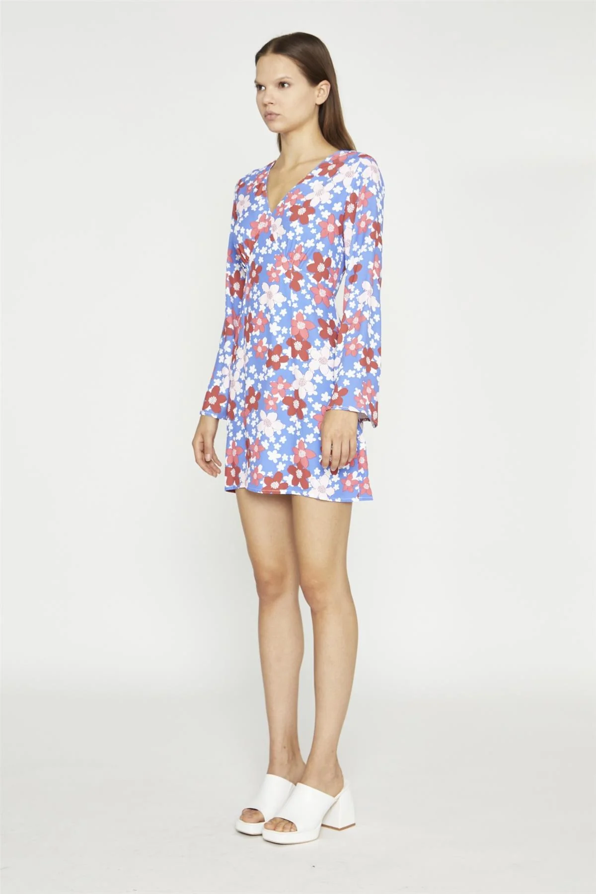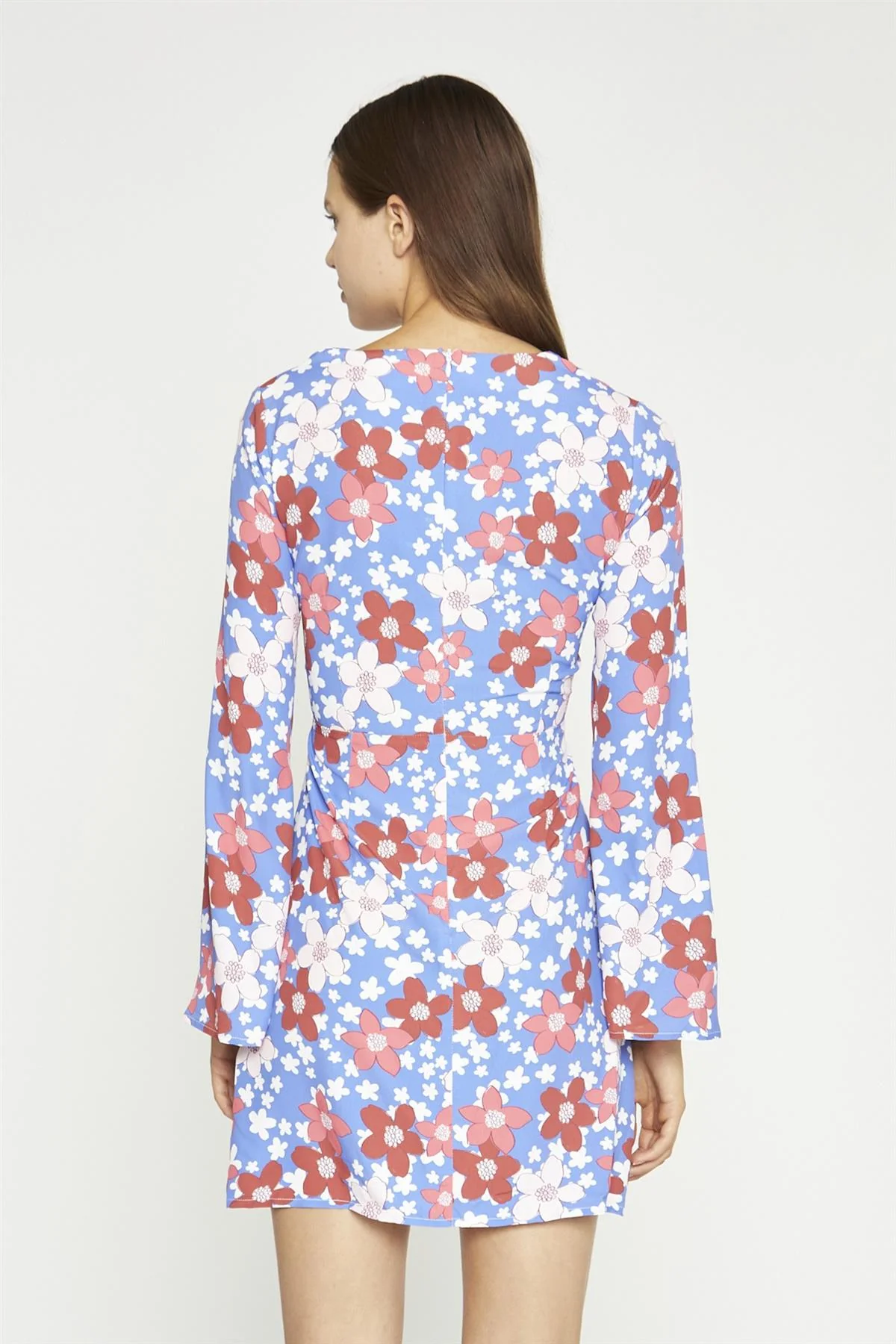 Blue-Red Flower Fluted Sleeve Mini-Dress