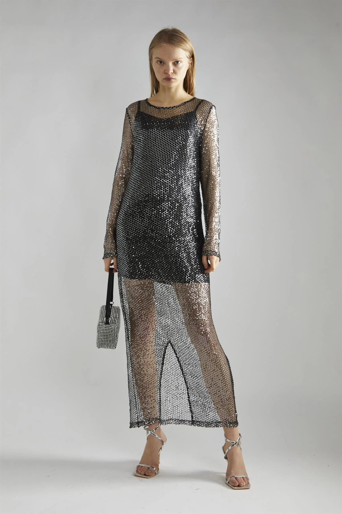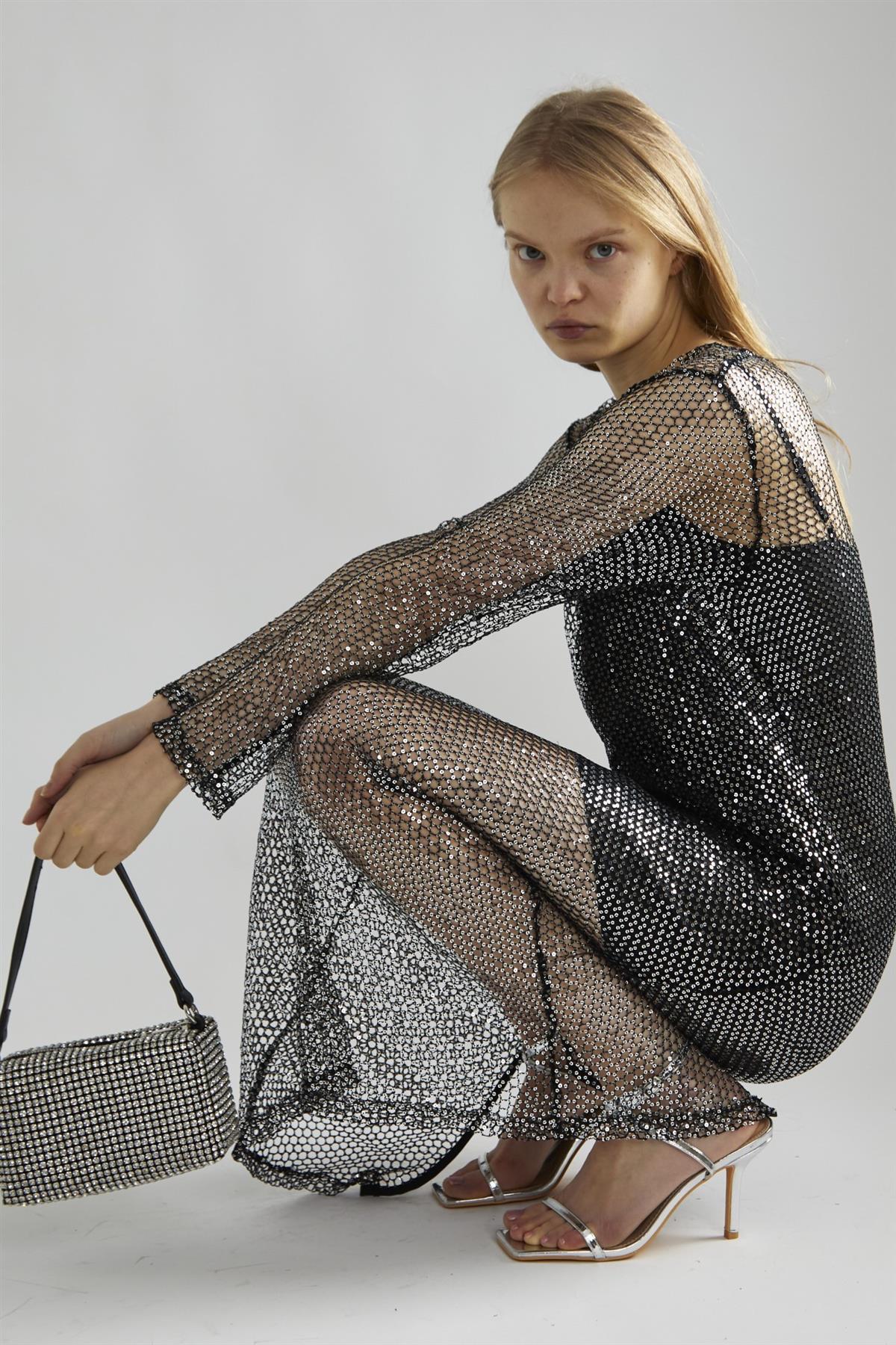 Black-Silver Sequin-Net Midi-Dress