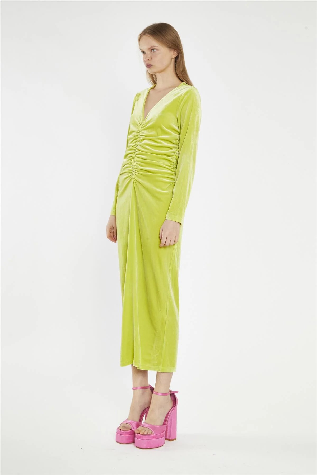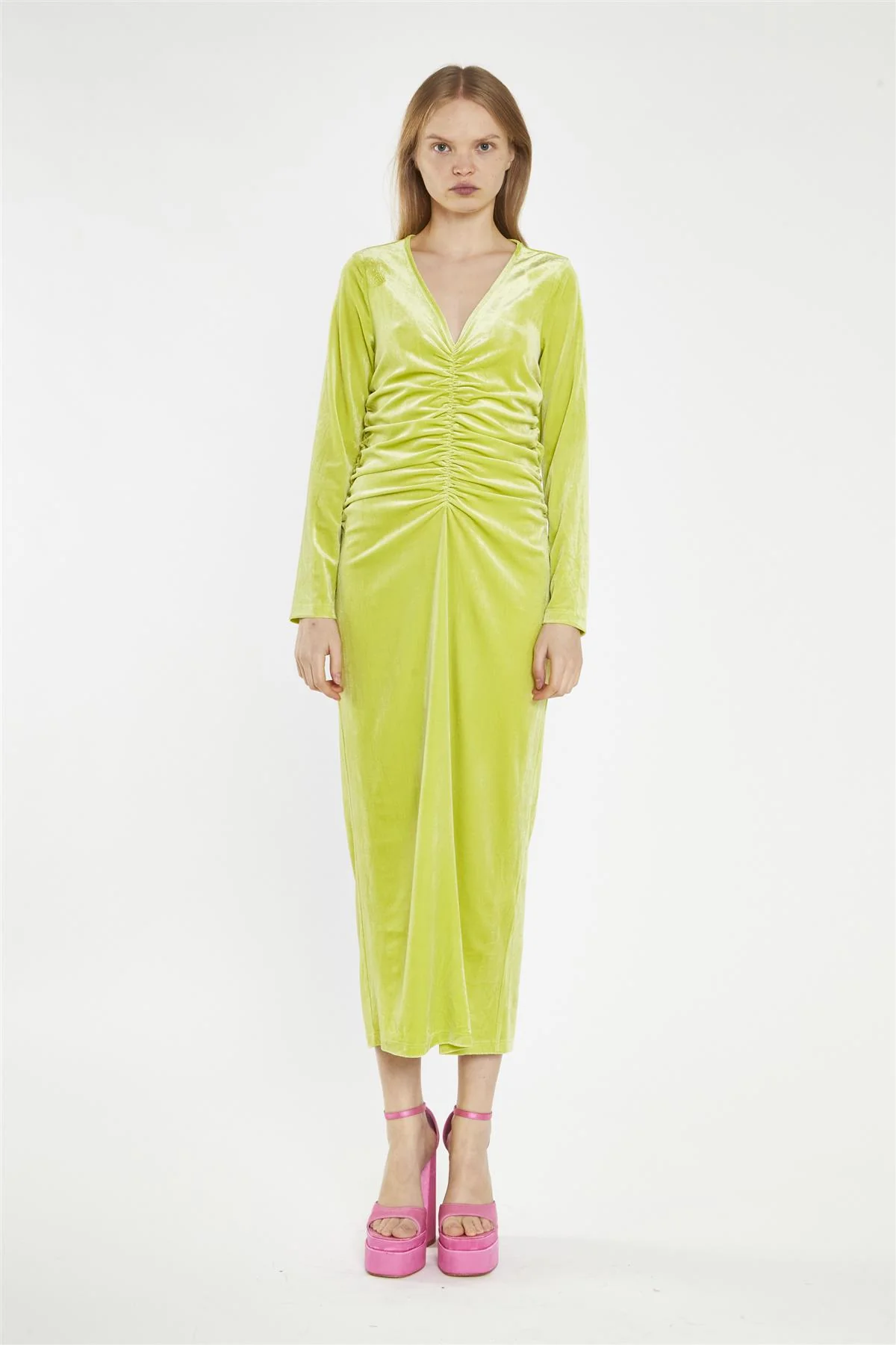 Lime-Green Velvet Ruched-Front Midi-Dress