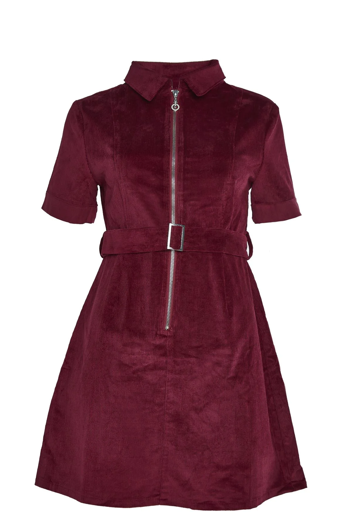 Wine-Corduroy Zip-Up Mini Dress