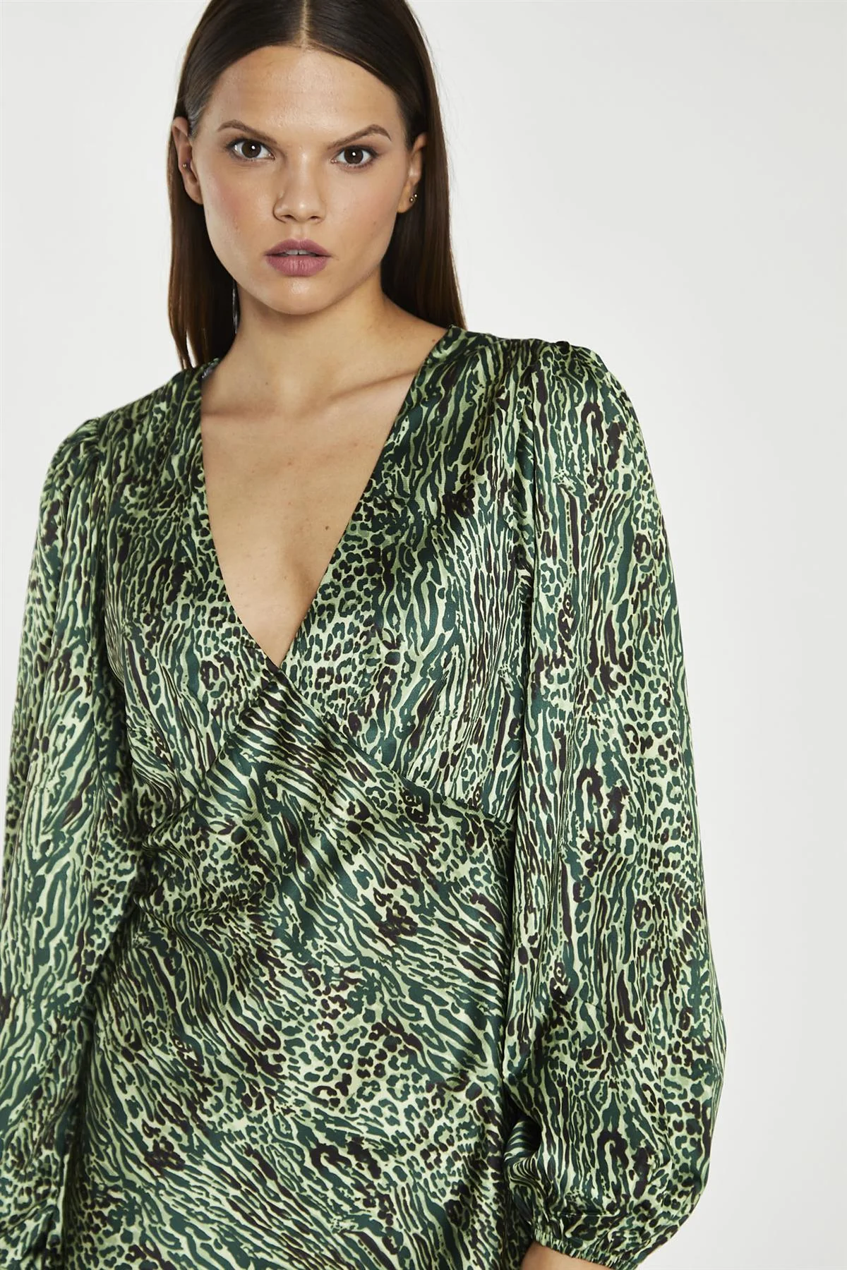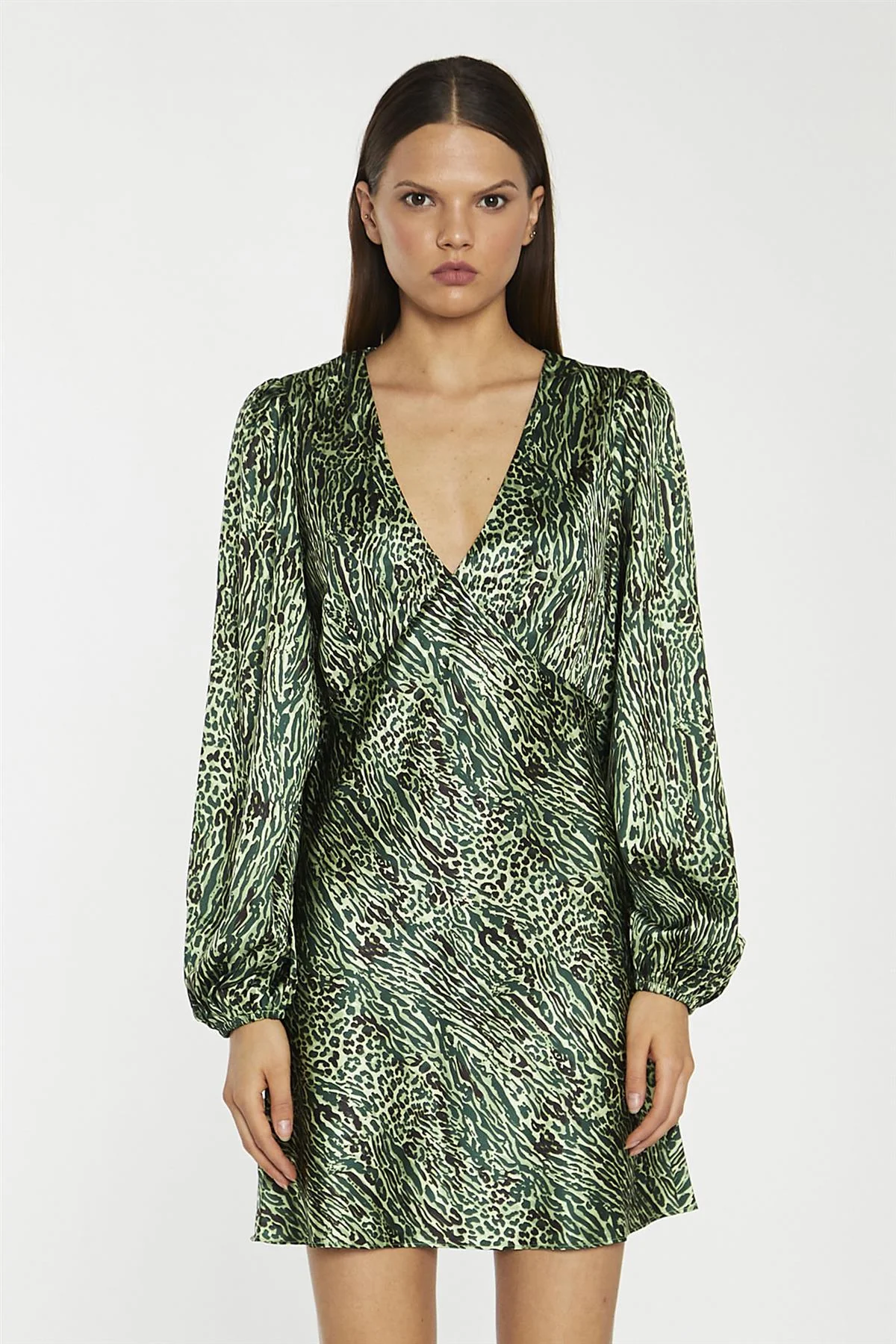 Green-Black Animal V-Neck Puff-Sleeve Mini-Dress