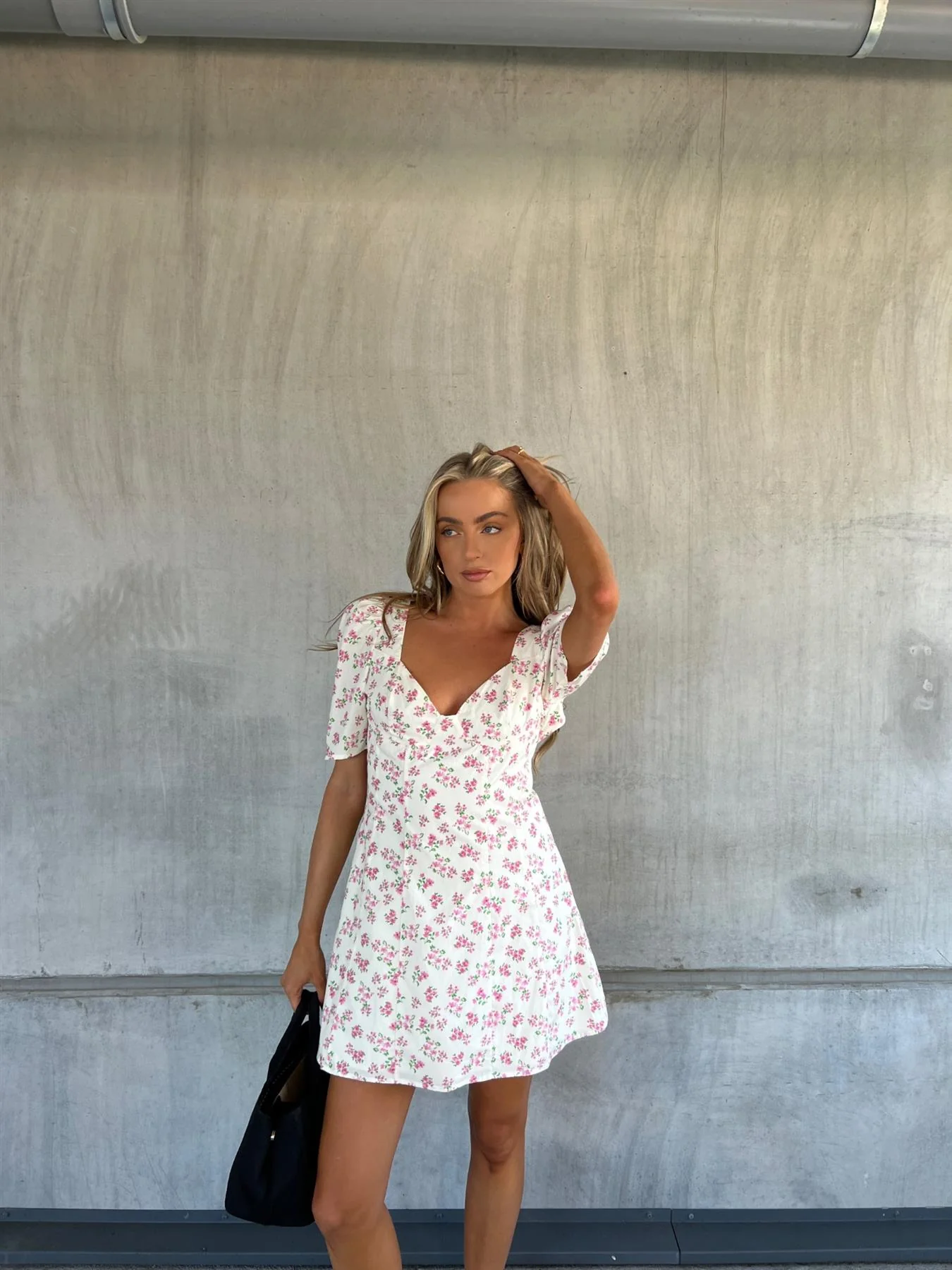Lola Bust Cup Skater Mini Dress with Cut-Out Back -Cream Pink Bouquet