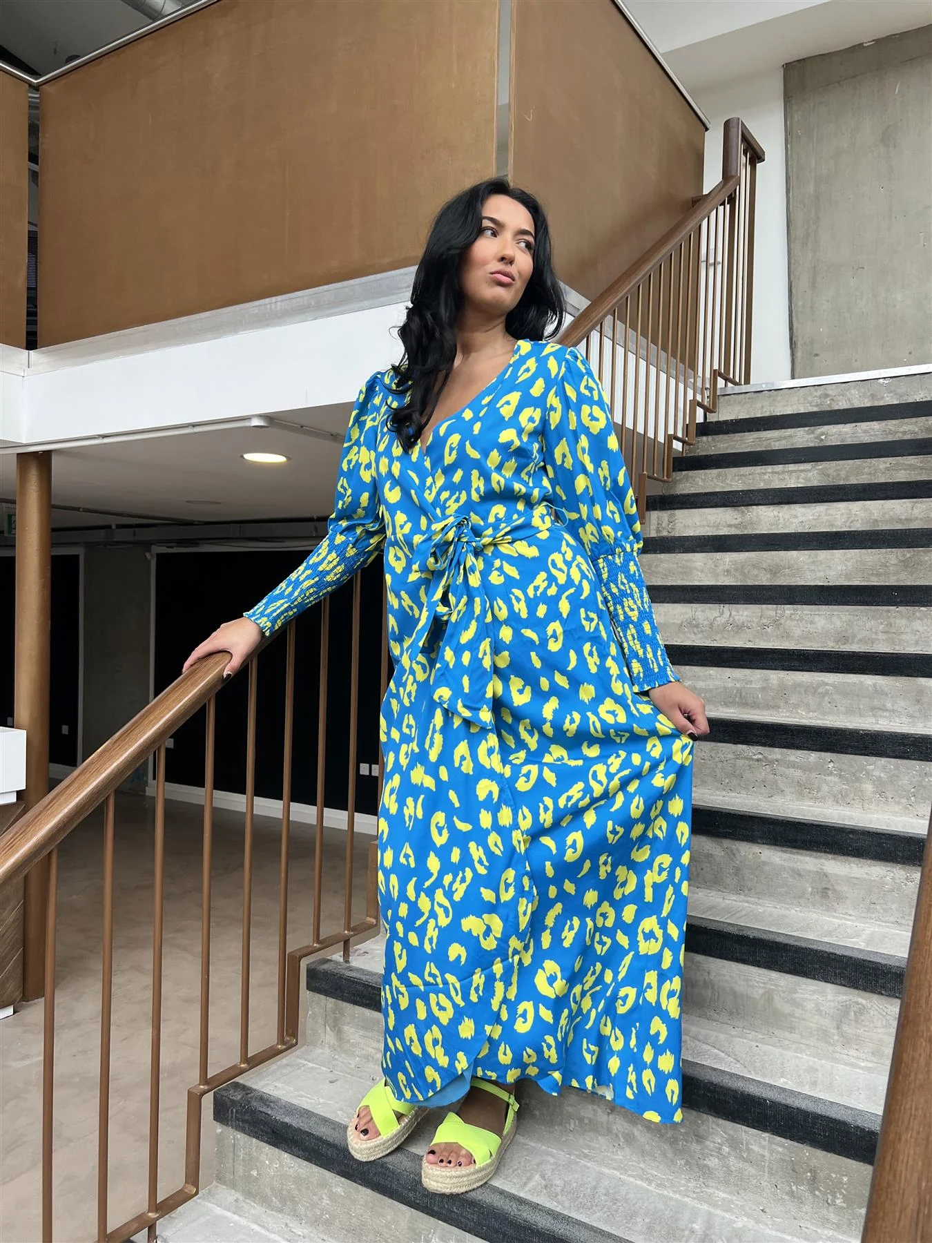 Cobalt-Yellow Leopard Wrap Midi-Dress