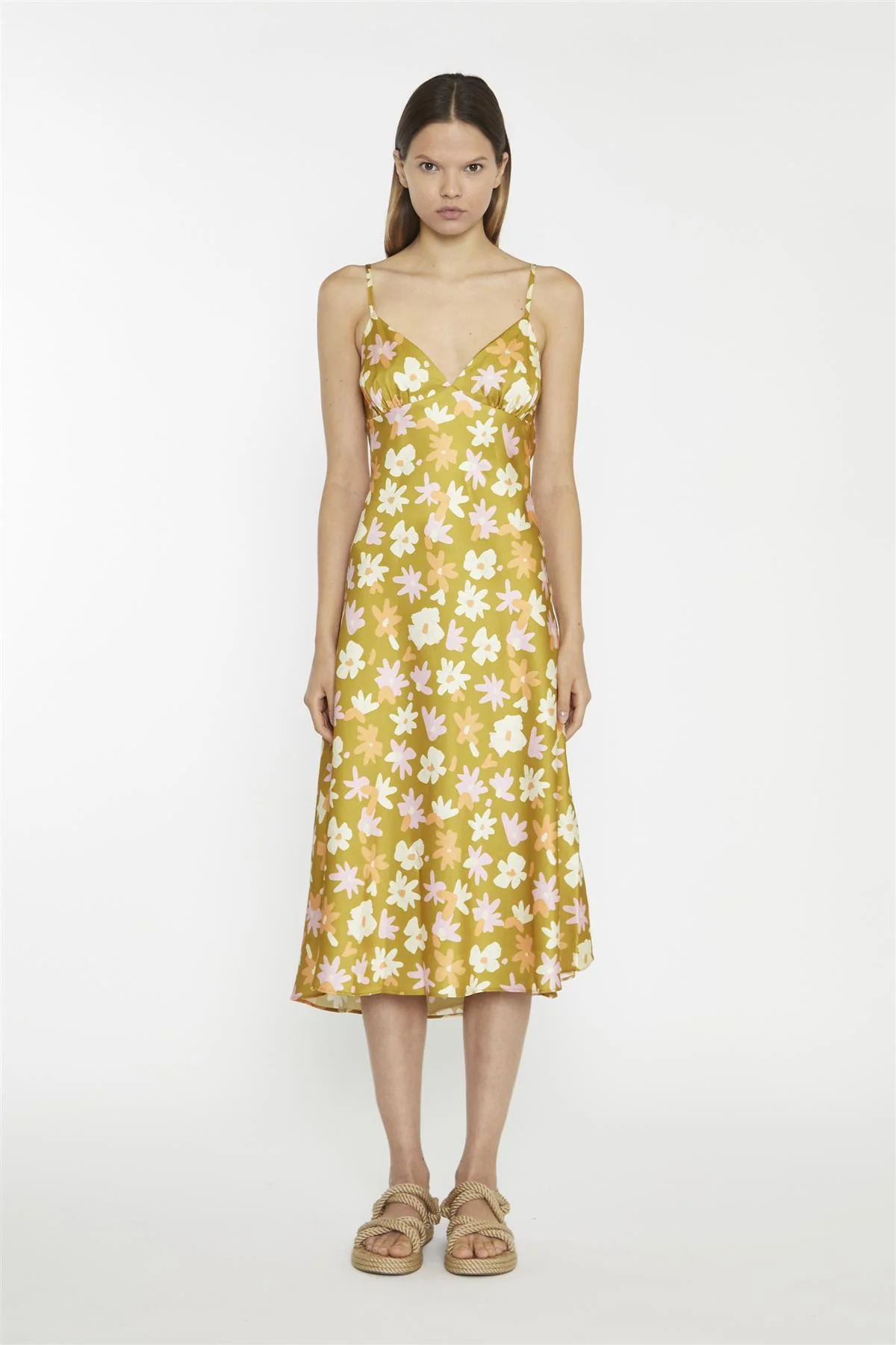 Olive Multi-Flower Spaghetti-Strap Midi-Dress
