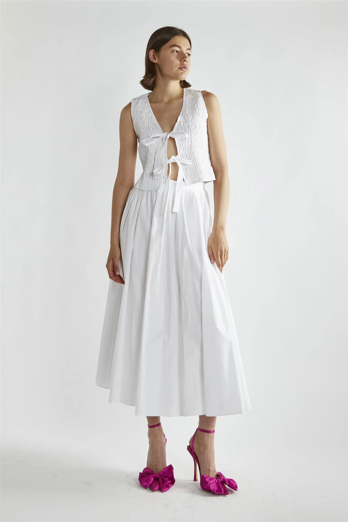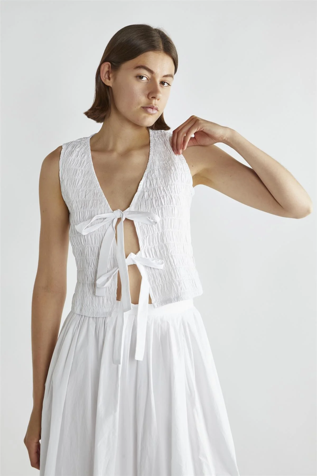 White Shirred Tie-Front Top