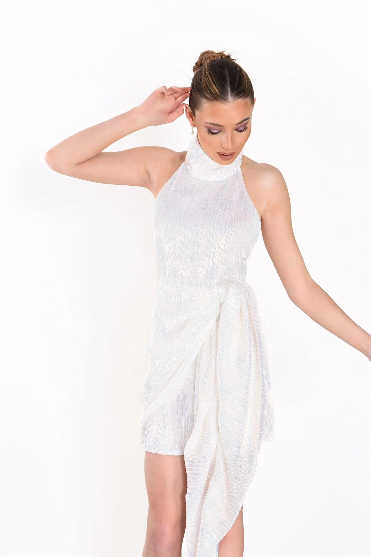 White Iridescent Sequin High Neck Backless Drape Skirt Detail Mini Dress