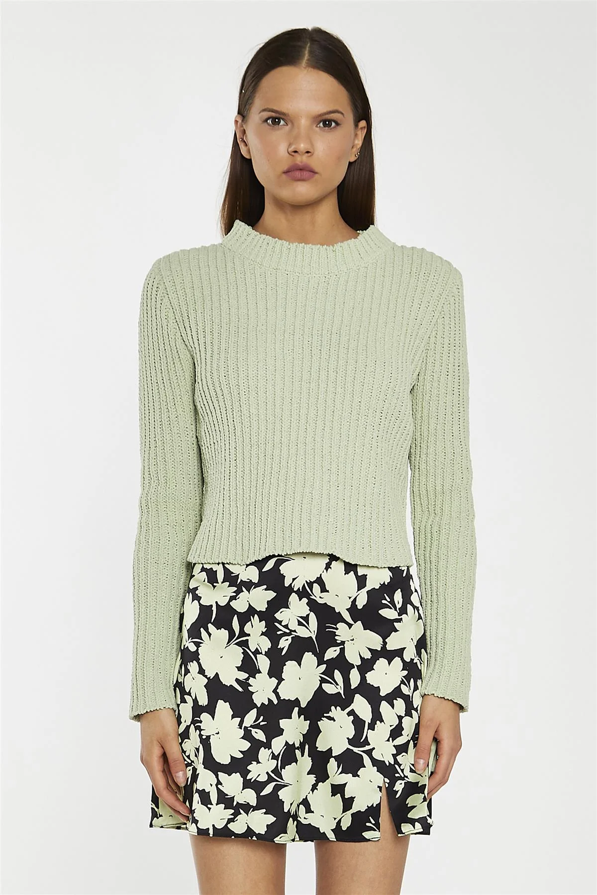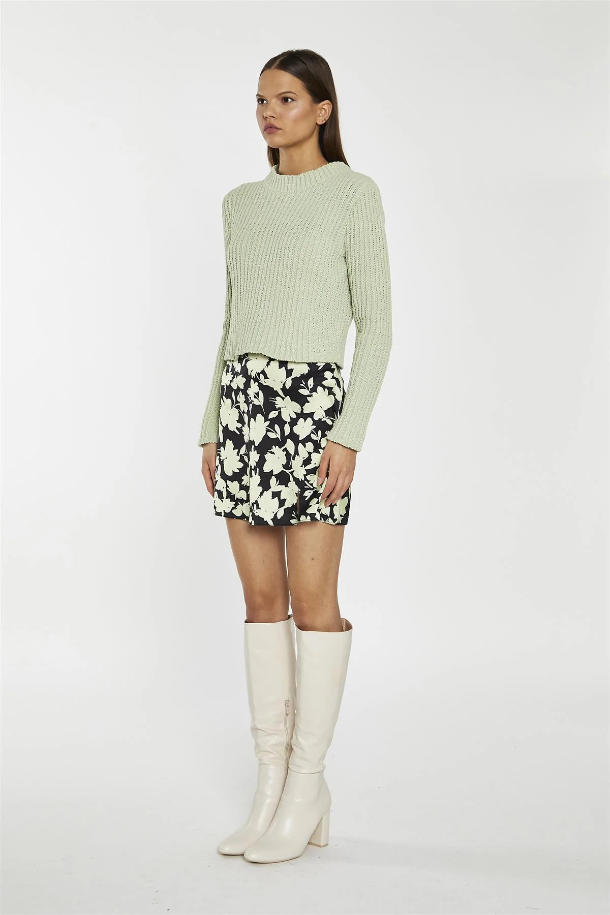 Soft-Lime Black-Floral Notch-Split Mini-Skirt