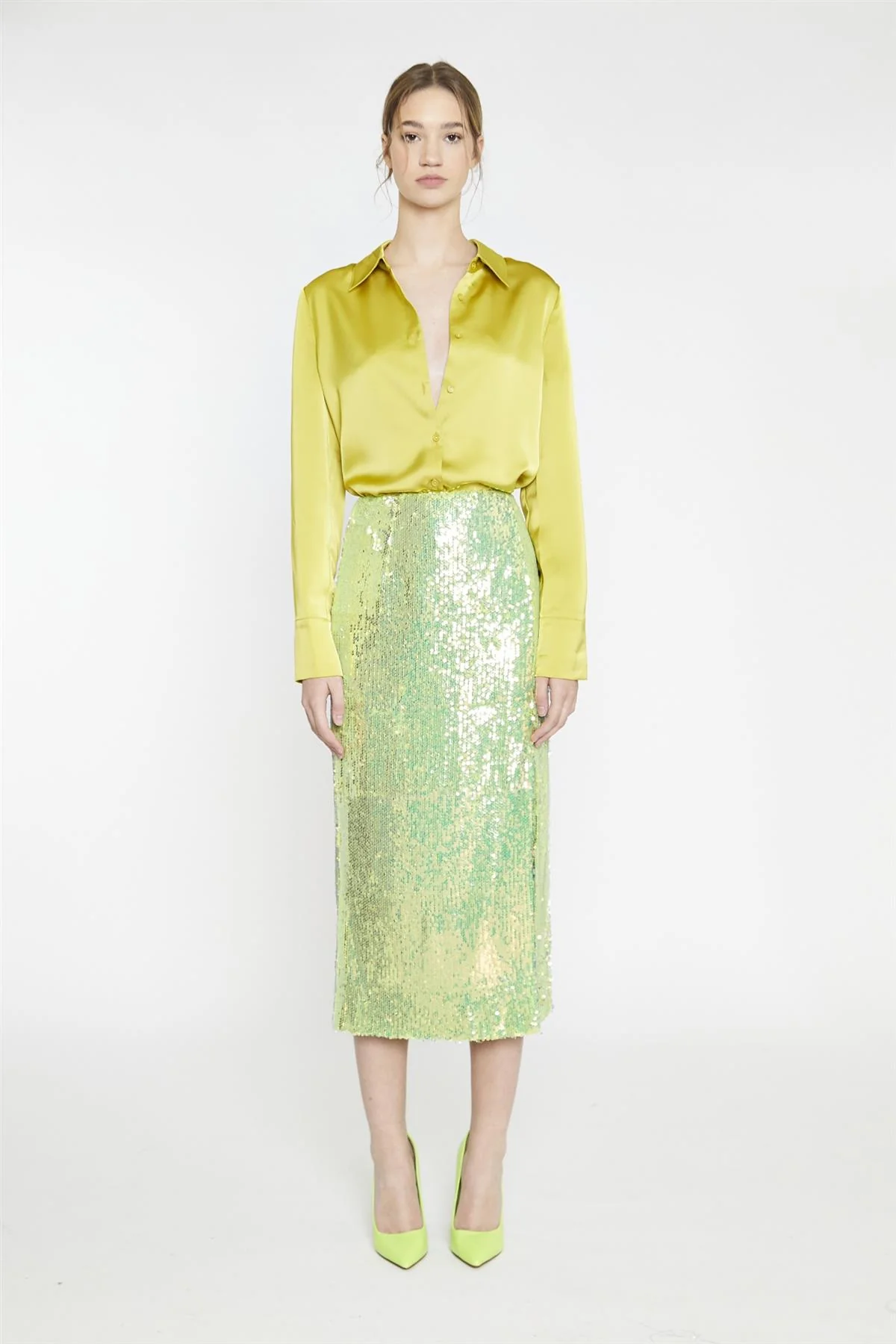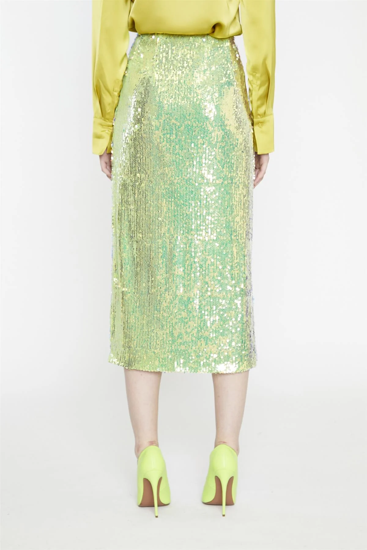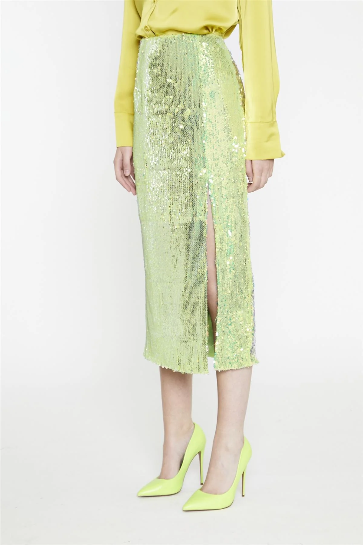 Iridescent-Lime-Sequin Side-Split Midi-Skirt