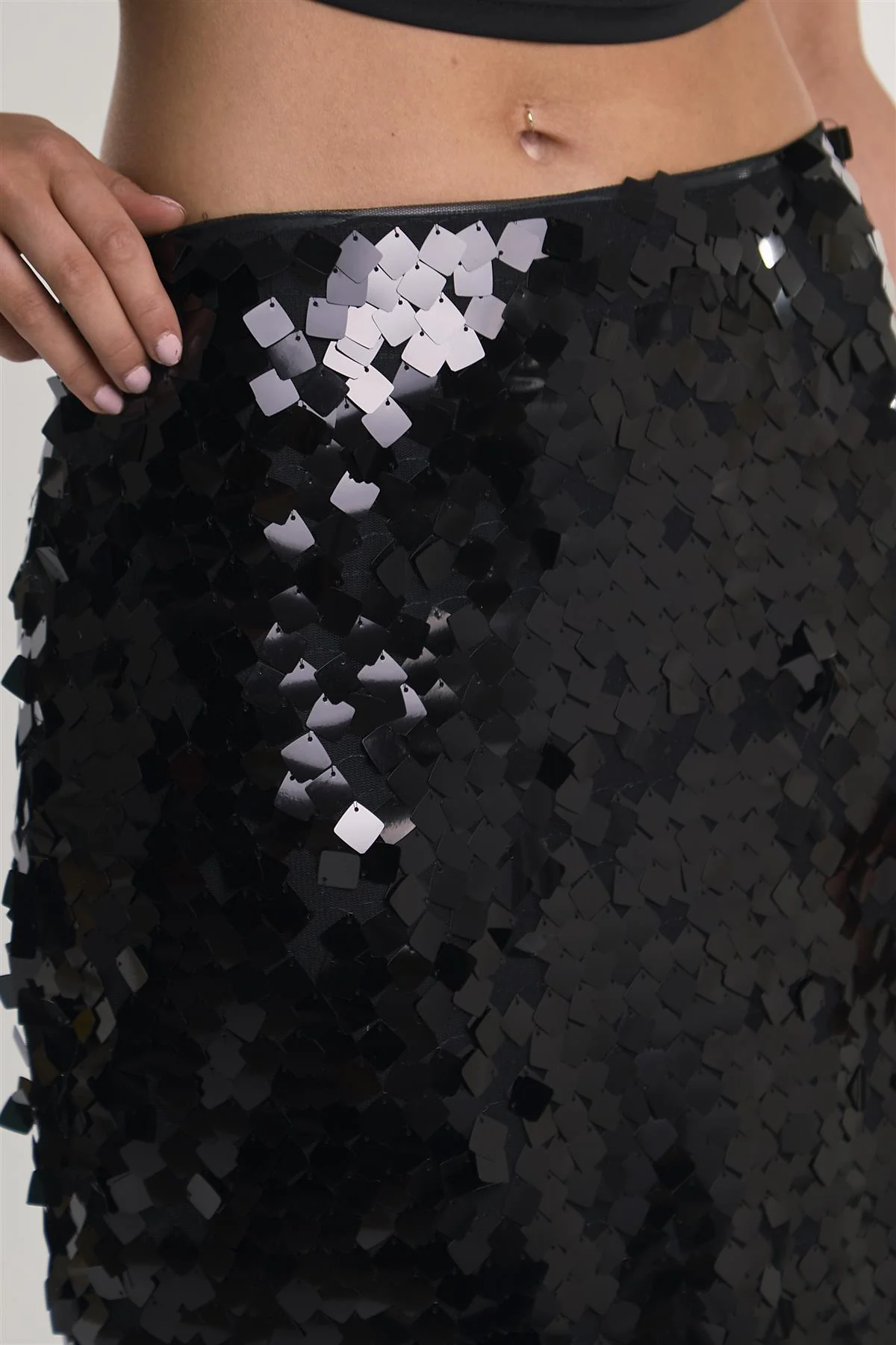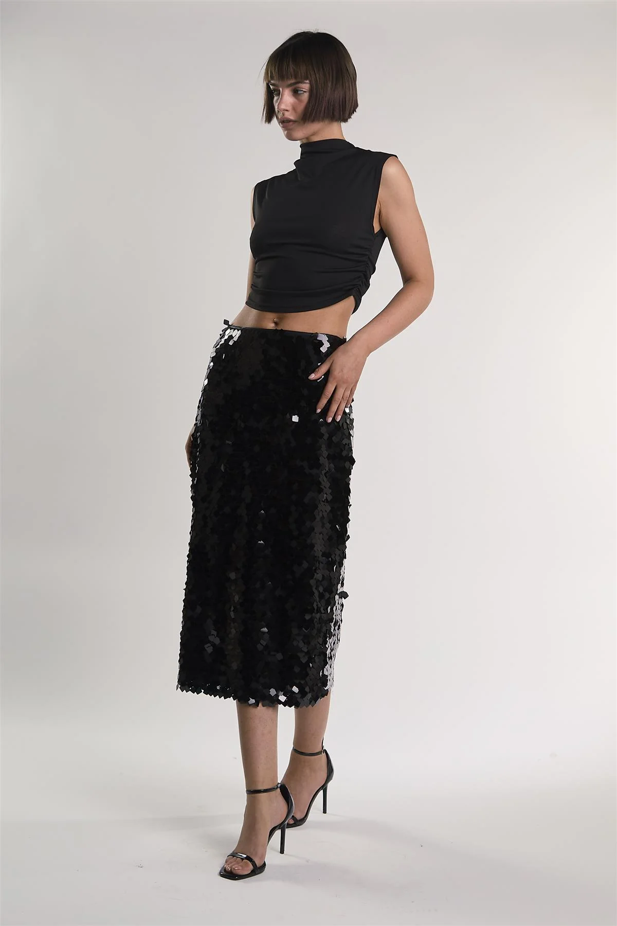 Black-Square-Sequin High-Waisted Midi-Skirt