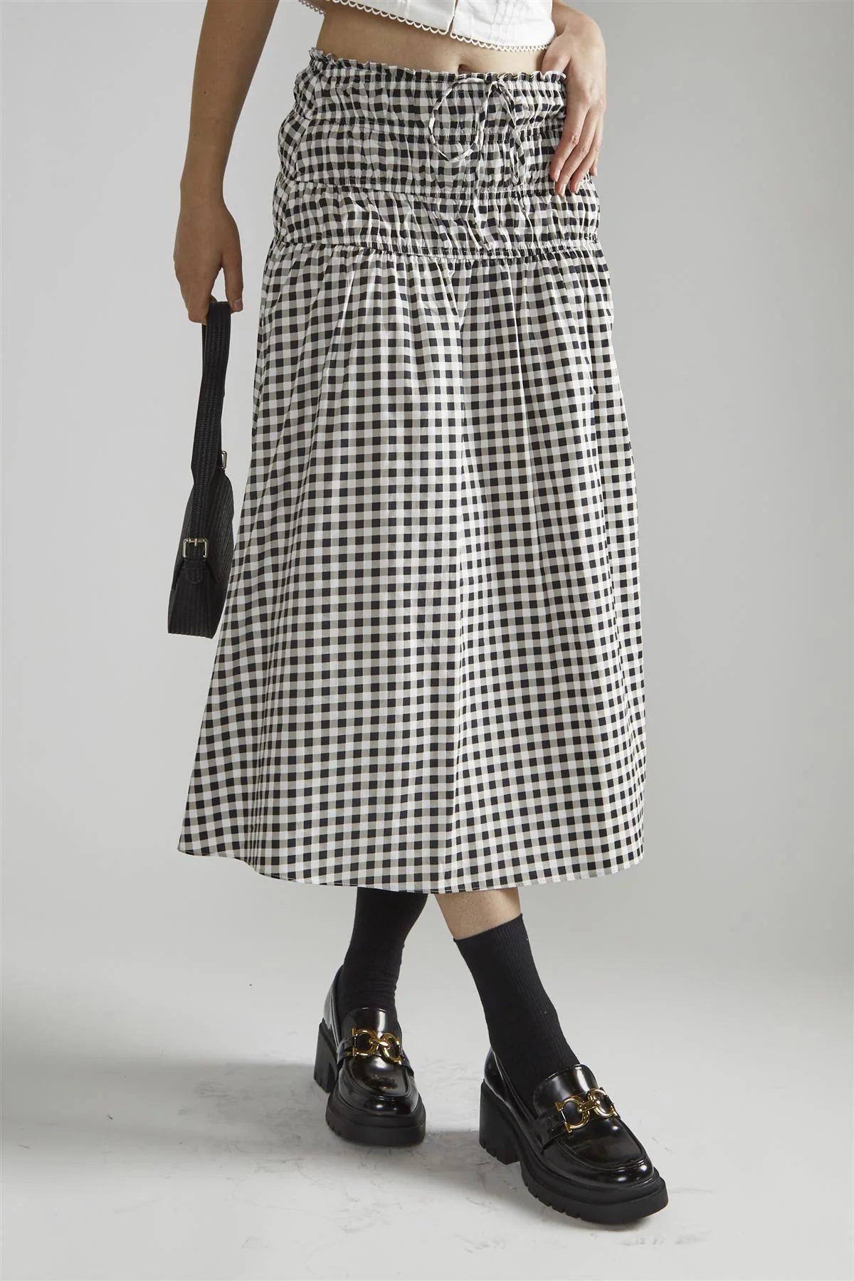 Black-White-Gingham-Print Smocked Midi-Skirt
