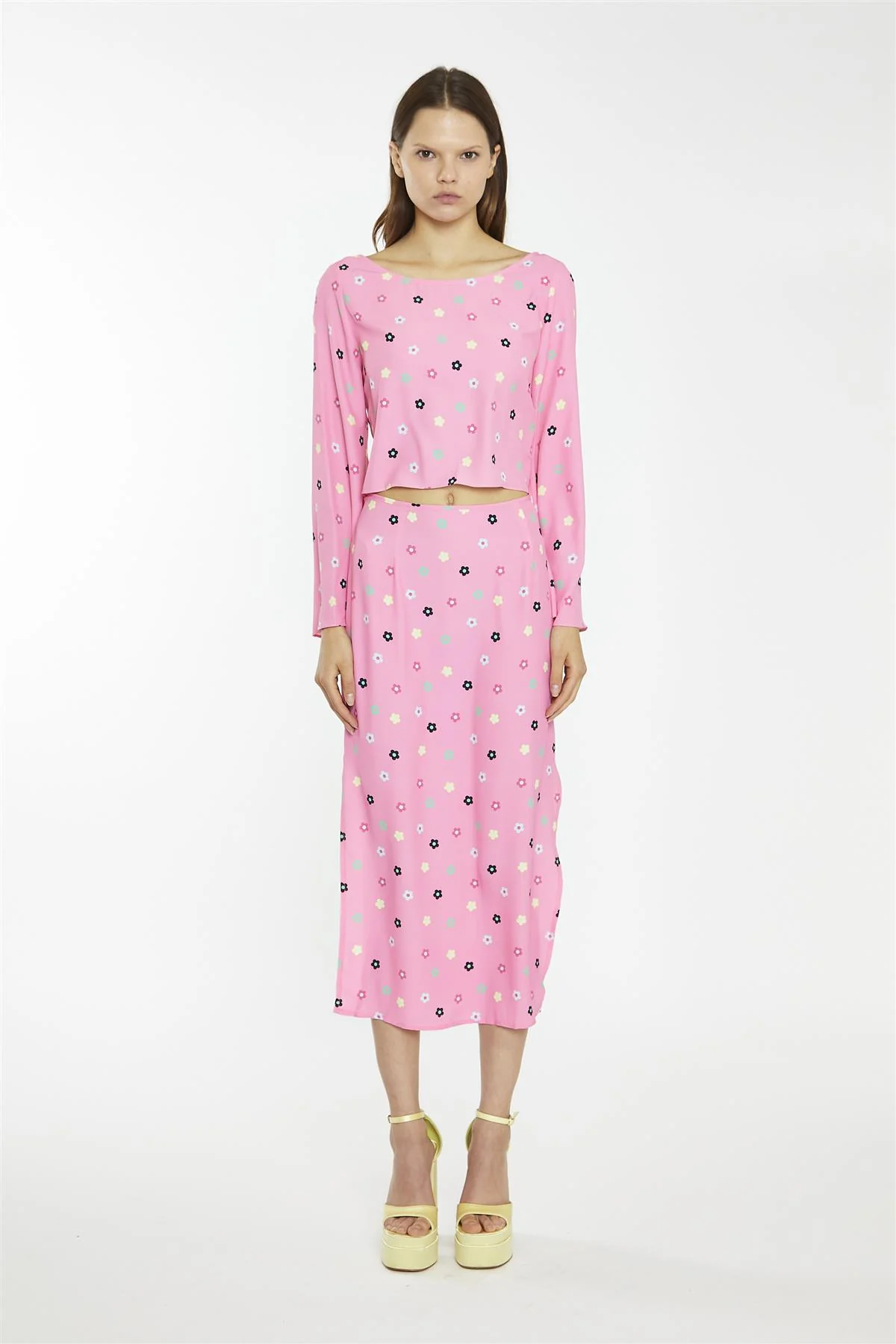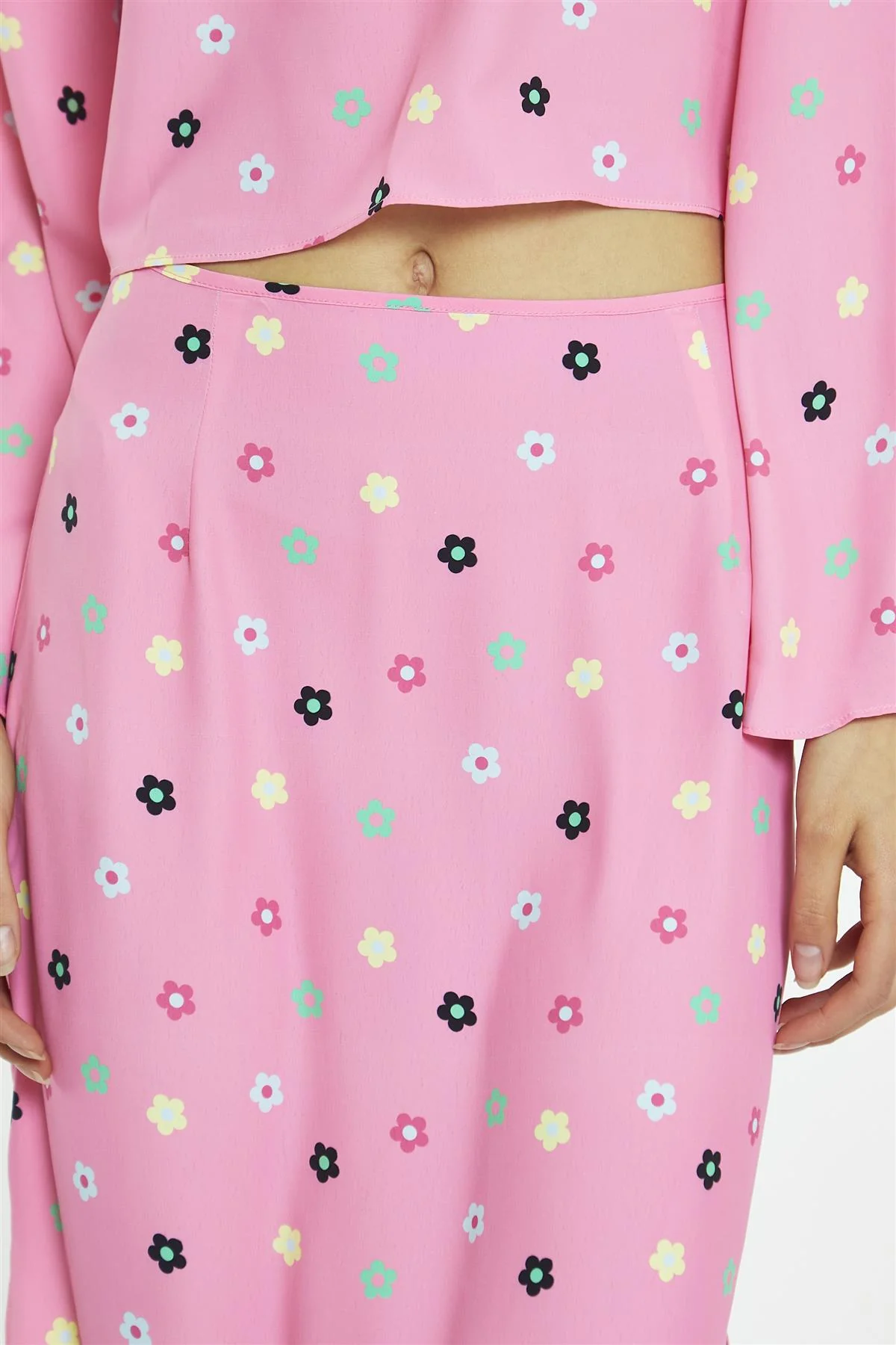 Pink Multi-Flower Bias-Cut Midi-Skirt