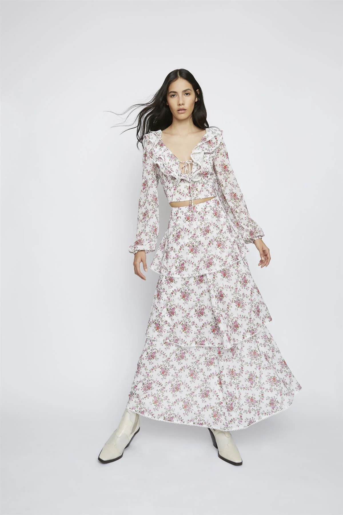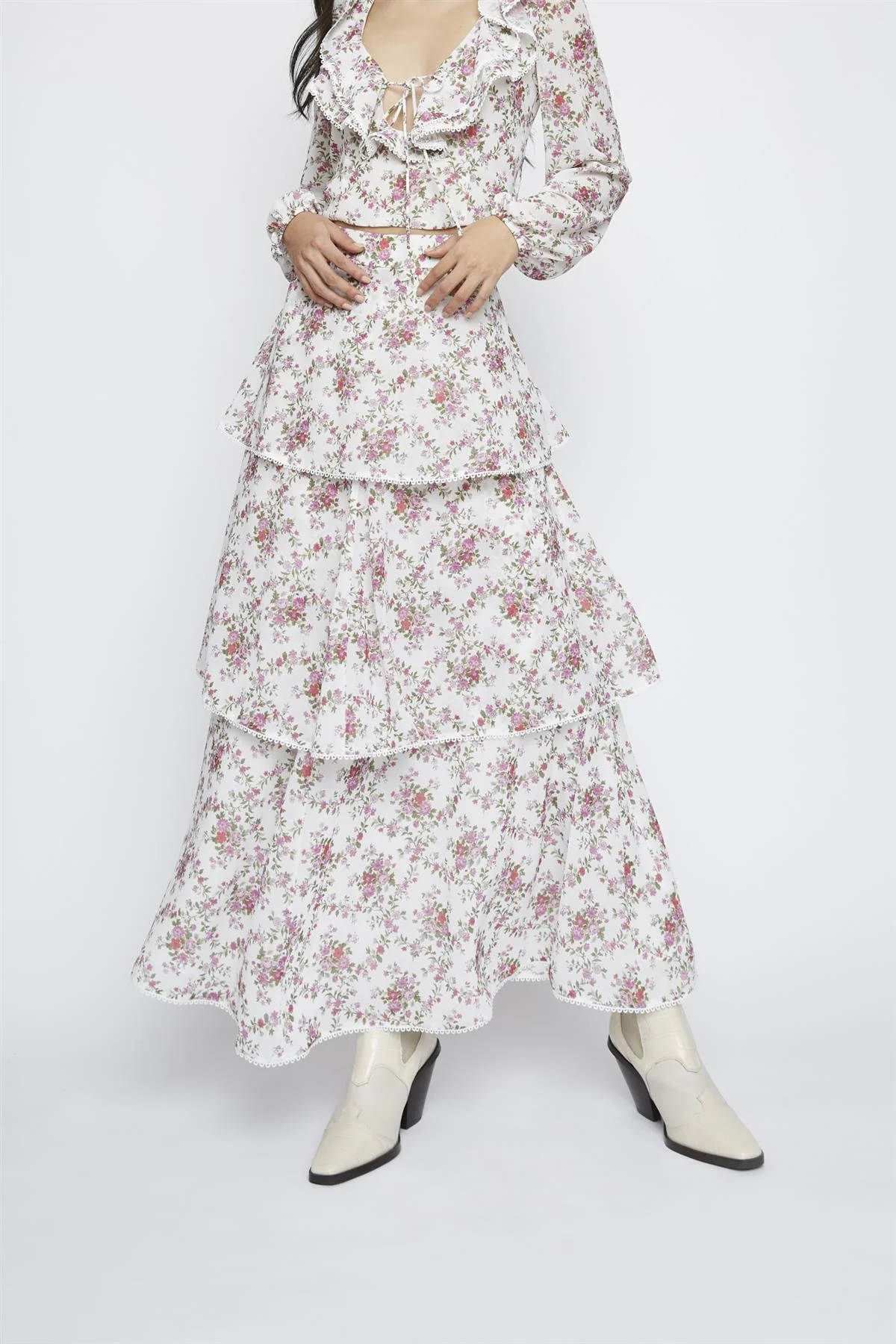 Romantic-Floral Chiffon Tiered Maxi-Skirt