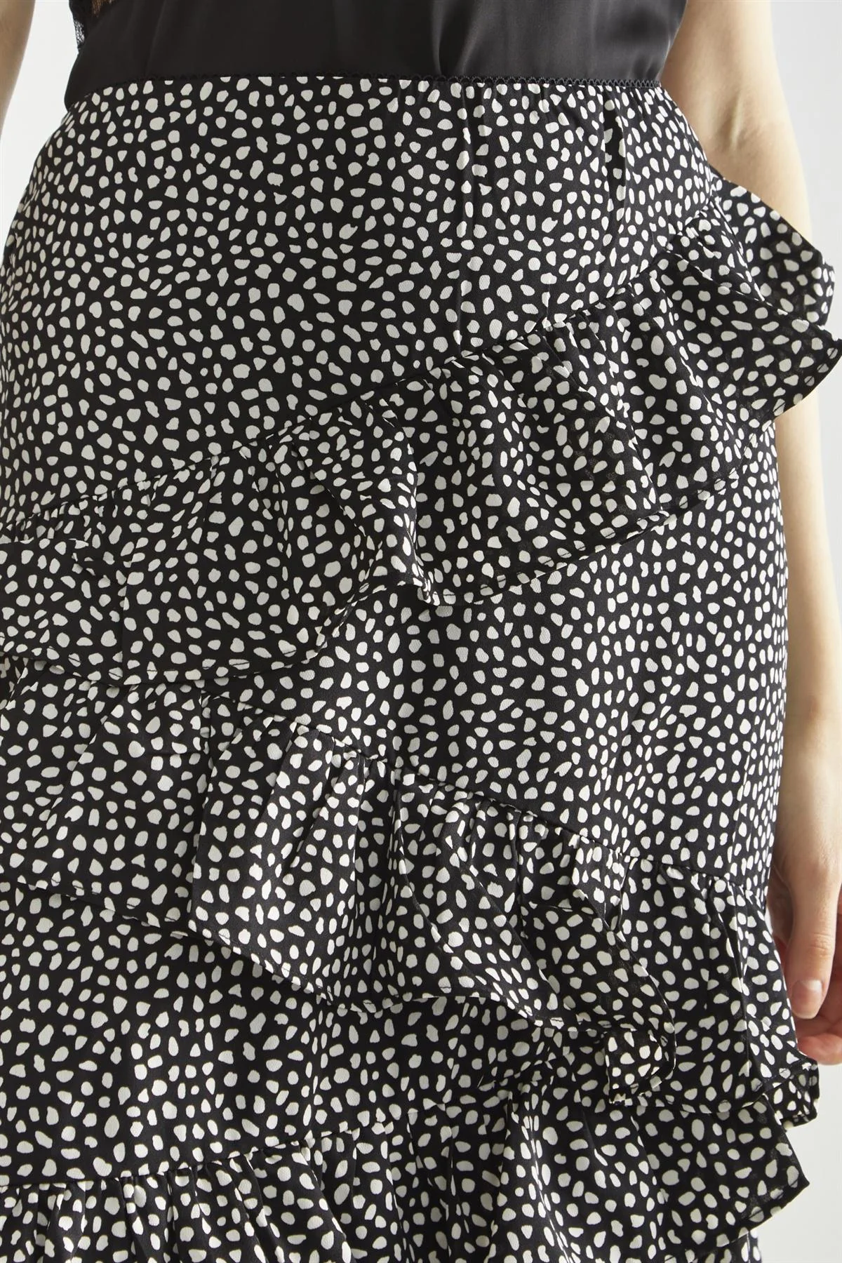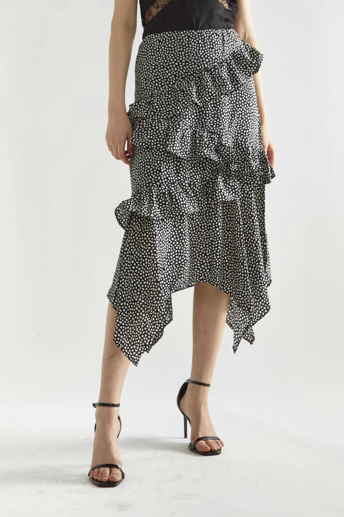 Black-Animal Spot Asymmetric Ruffle Midi-Skirt