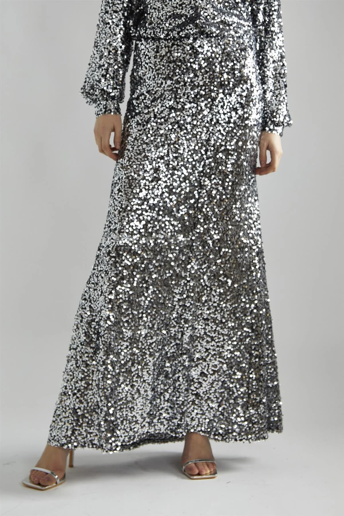 Black-Silver Sequin Bias-Cut Maxi-Skirt